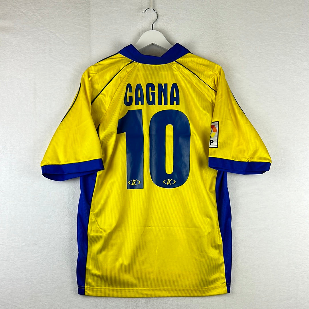 Shirt info: The 2000-2001 home shirt worn by Villarreal during the La Liga season. The bright yellow football shirt made famous by Villarreal features; a blue collar with zip, a felt Villarreal badge, and a printed Kelme logo and 'Terra Mitica' sponsor. The shirt has blue trim throughout. The sleeves have the La Liga 'LFP' patch sewn on. It has the official 'Kelme' licensed product badge on the lower front. 'Cagna 10' is printed in blue plastic flock on the back.