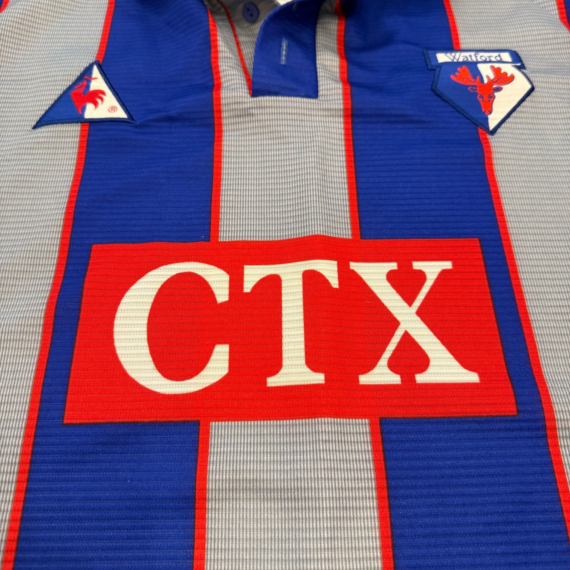 Shirt info: The 1998/1999 away shirt for Watford with CTX Computer Products front sponsor. This was an interesting design for Watford with a waffle-type material that did not catch on.