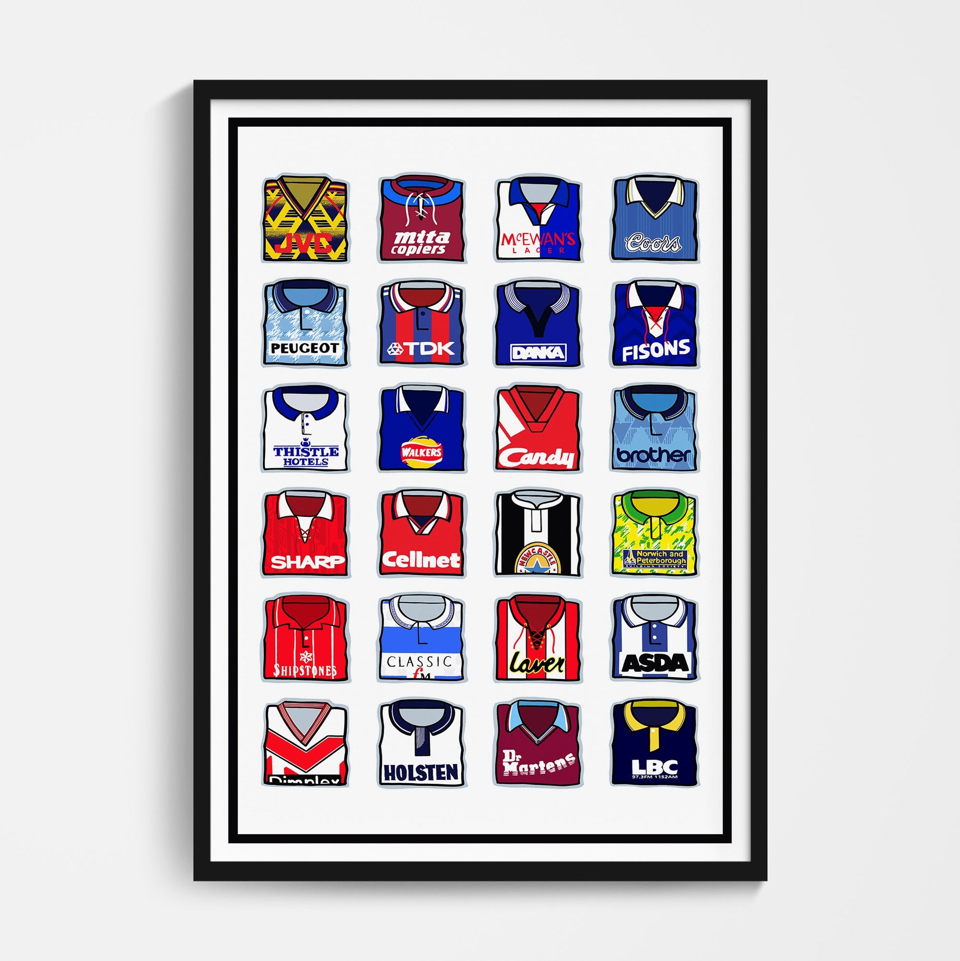 Original design featuring iconic classic retro Premier League/First Division football shirts on a quality poster.
