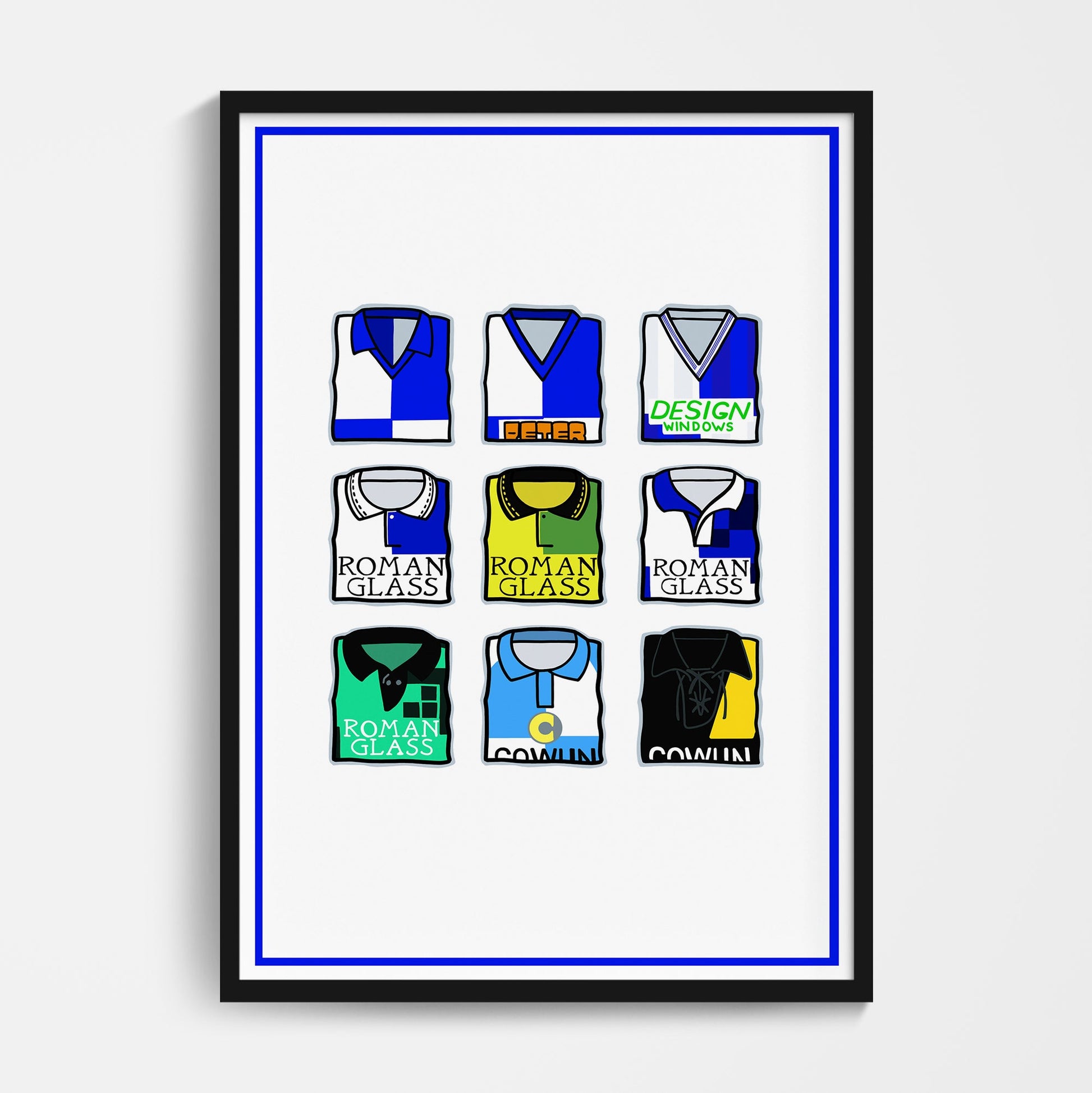 Original design featuring iconic classic retro Rovers football shirts on a quality poster.