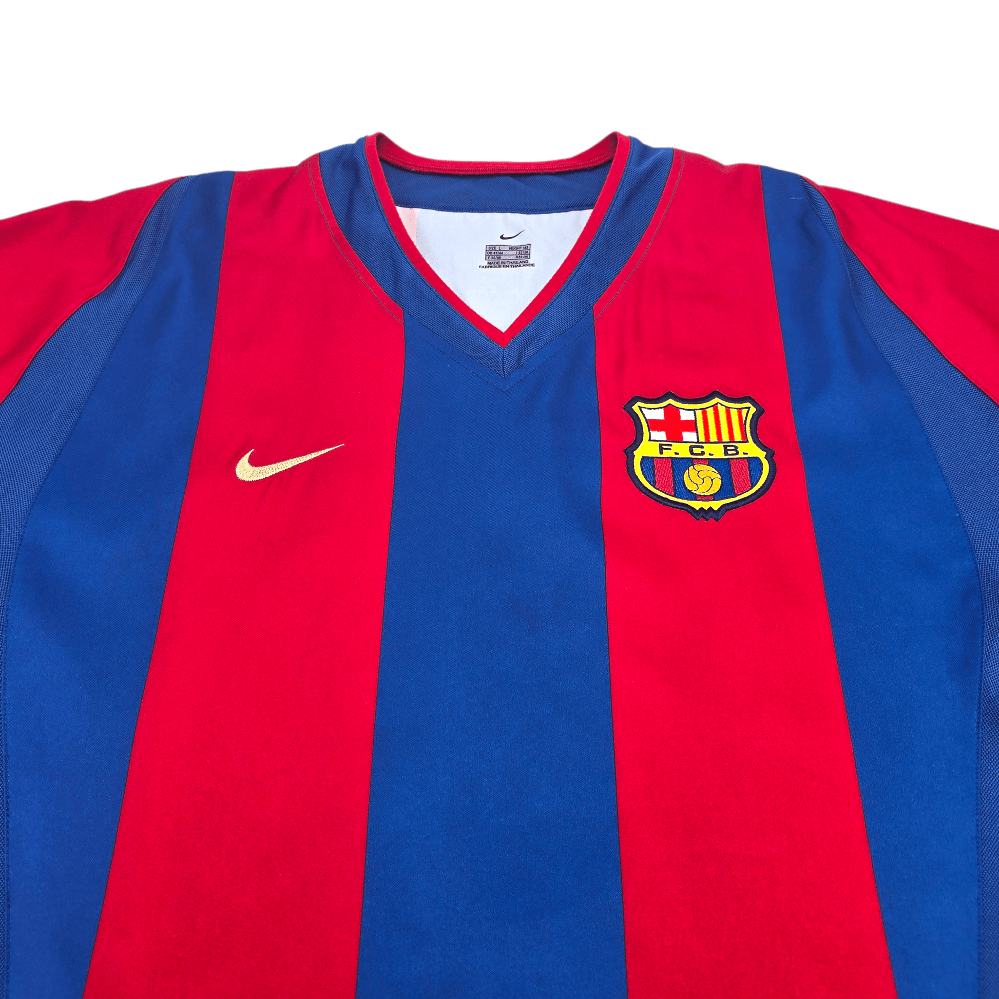 Information: Official Nike Barcelona home football shirt, as worn by the ‘Blaugrana’ during the 2002/03 season, when the side competed in La Liga and reached the quarter-finals of the UEFA Champions League during a turbulent campaign that preceded a major rebuild at the club. The reverse of the shirt boasts the nameset of club legend, Ronaldinho. A fantastic vintage jersey, ideal for a collection of your own or the perfect gift for any football fan.