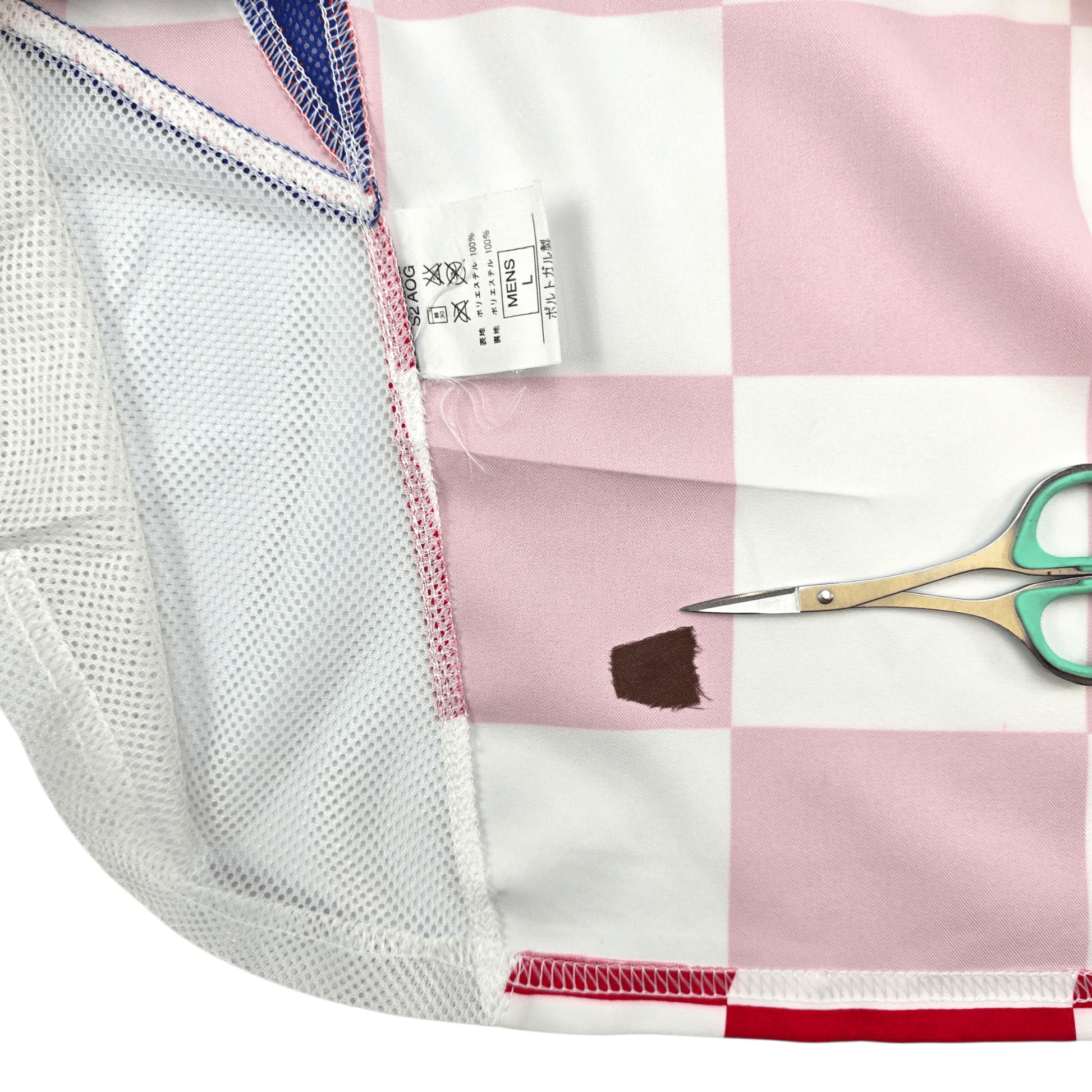 Condition: Very Good. A noticeable mark on the bottom front of the shirt which has been repaired, slight cracking to the internal neck label and a slight wear and discolouration to the collar (all shown in the photos). Despite these signs of wear, this is still a fabulous shirt in a very good condition.