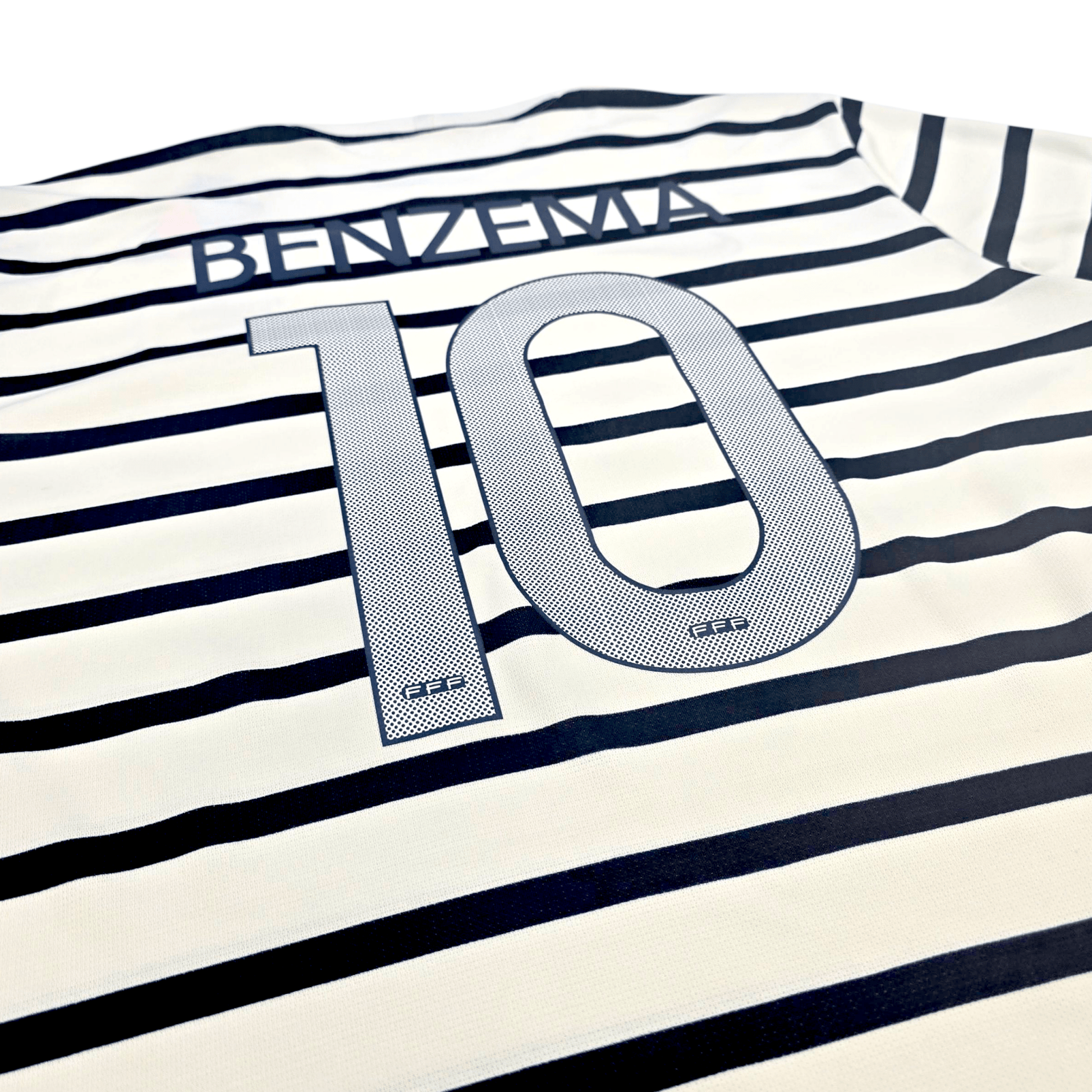 Information: Official Nike France away football shirt, as worn by ‘Les Bleus’ during the 2011/12 season, when the side qualified for Euro 2012 under Laurent Blanc, showcasing a new era of stylish minimalism in their kit design. The reverse of the shirt boasts the nameset of team legend, Karim Benzema. A fantastic jersey, ideal for a collection of your own or the perfect gift for any football fan.