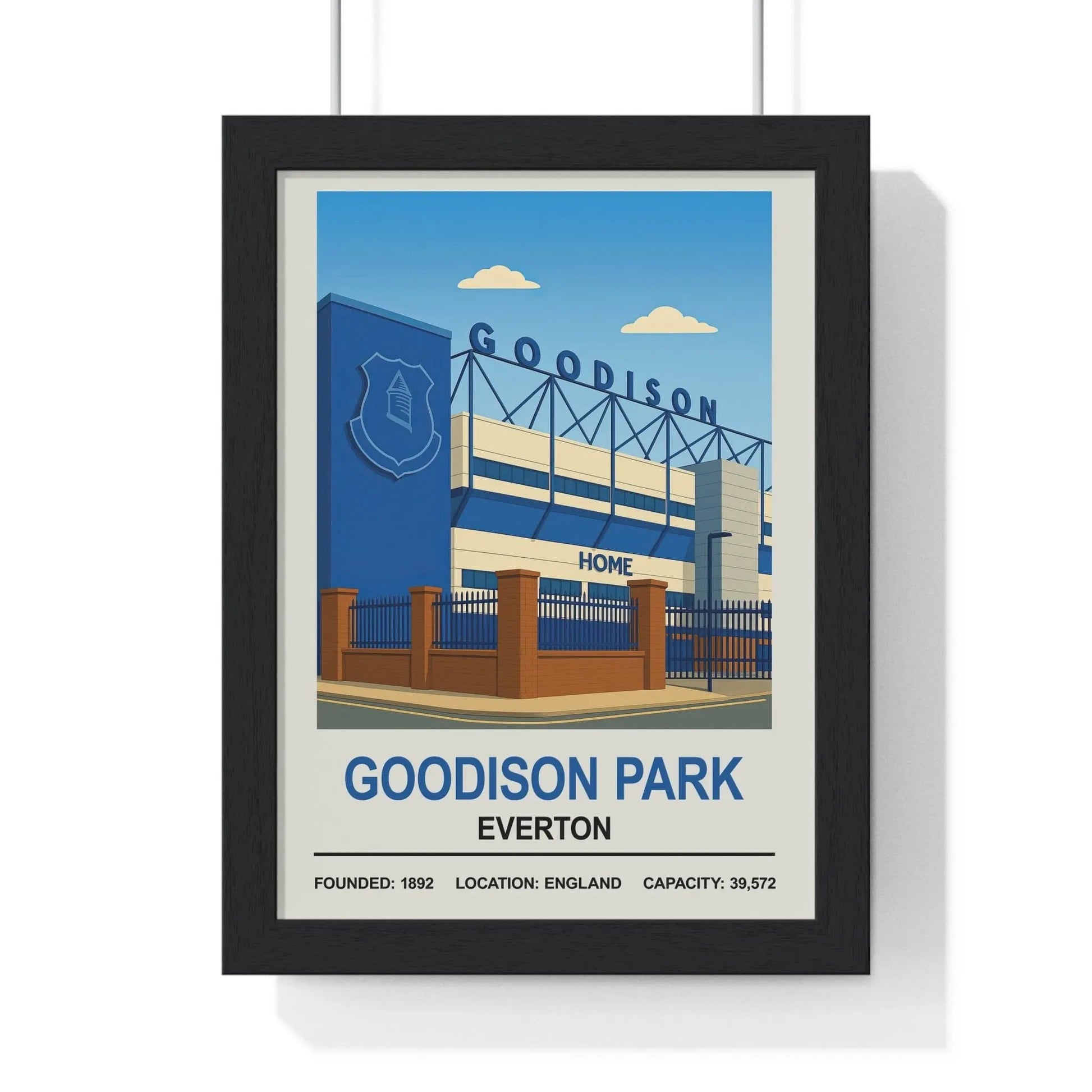 This minimalist poster honours the iconic architecture of Goodison Park Inspired, capturing the match‑day atmosphere beloved by Everton supporters.