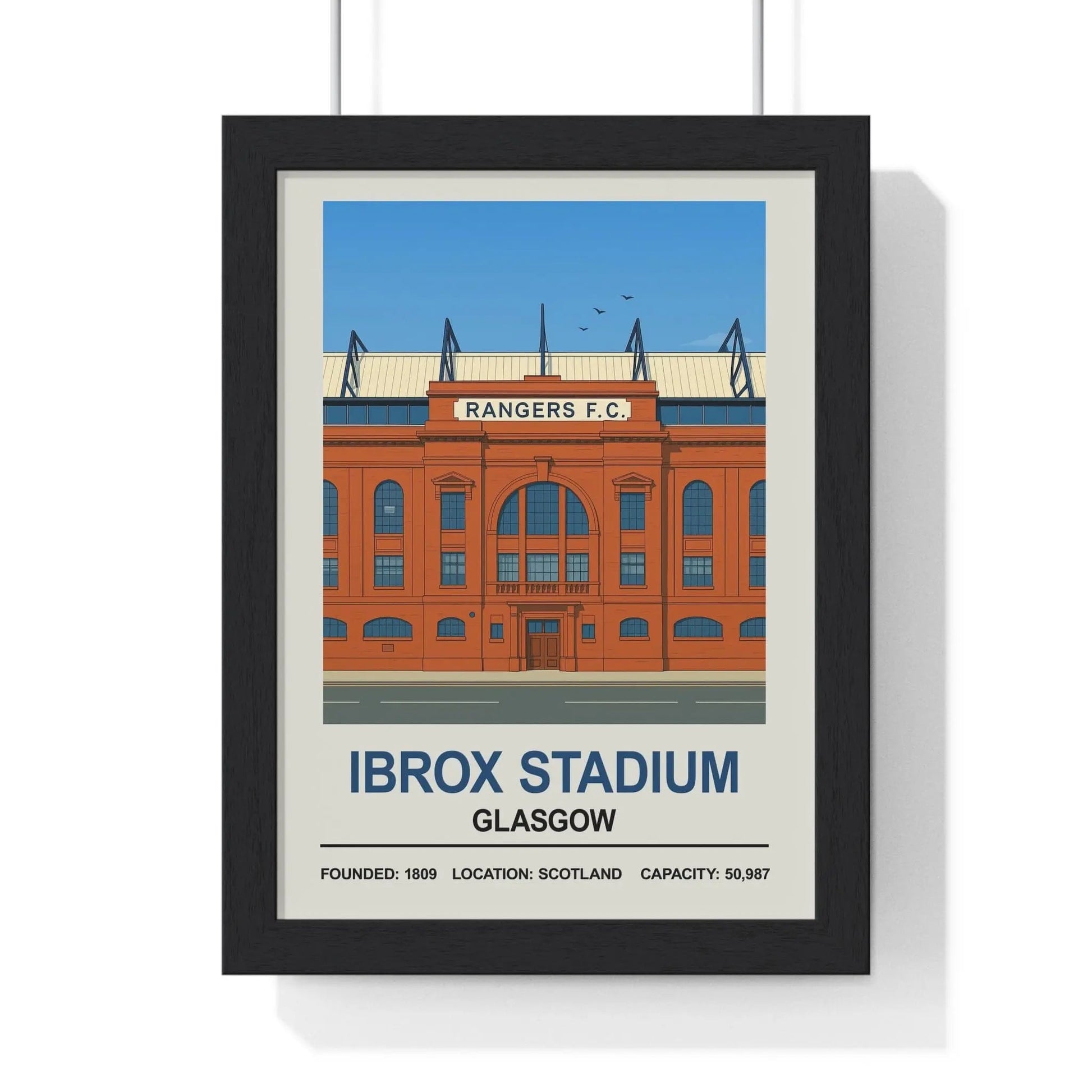 This minimalist poster honours the iconic architecture of Ibrox Stadium, capturing the match‑day atmosphere beloved by Rangers supporters.