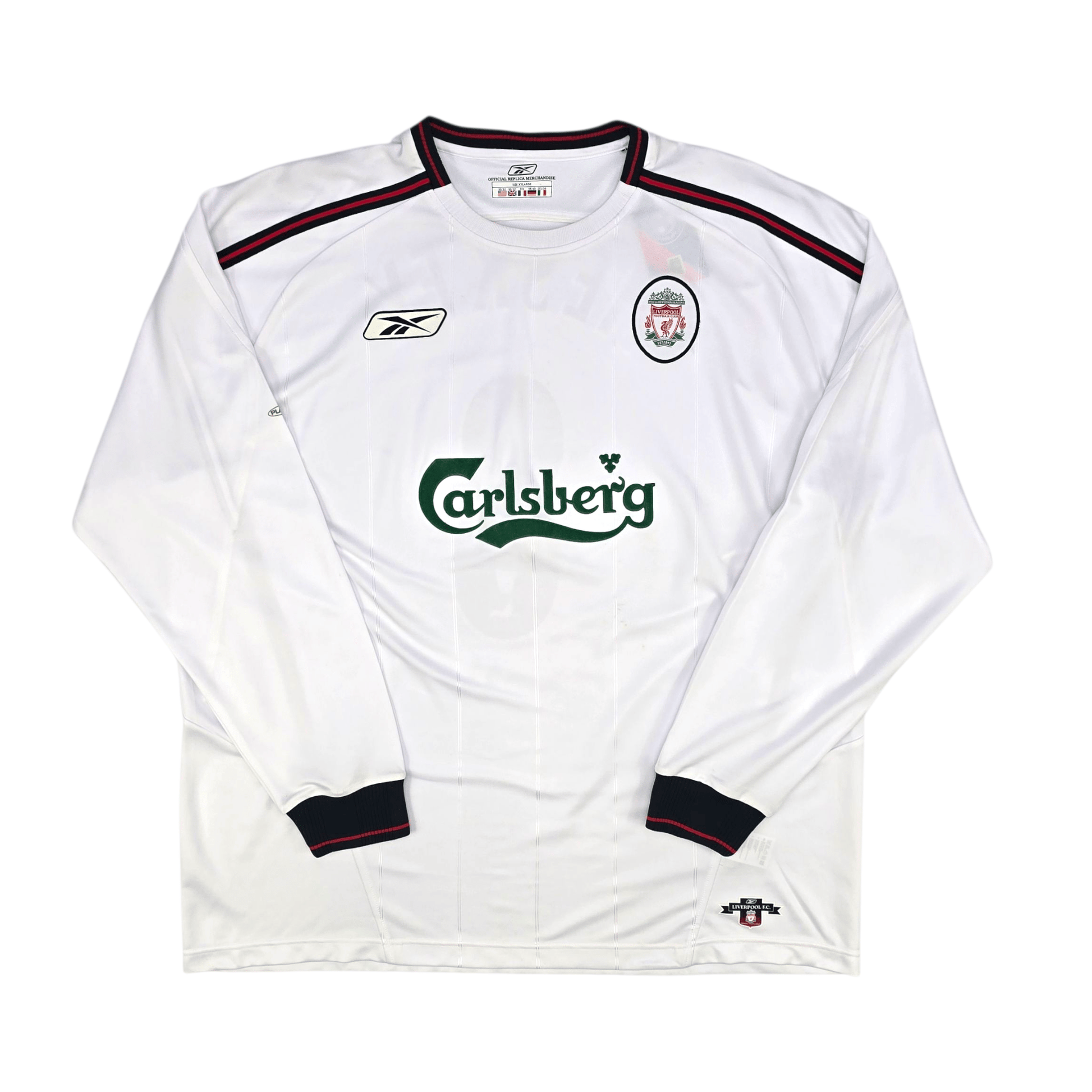 Information: Official Reebok Liverpool away football shirt, as worn by 'The Reds' during the 2003/05 seasons, when the side finished fourth and fifth in the Premier League. The reverse of the shirt boasts the nameset of club legend, Emile Heskey. A fantastic vintage jersey, ideal for a collection of your own or the perfect gift for any football fan.