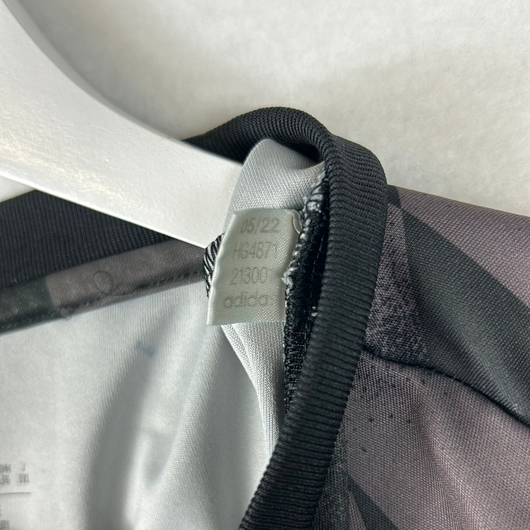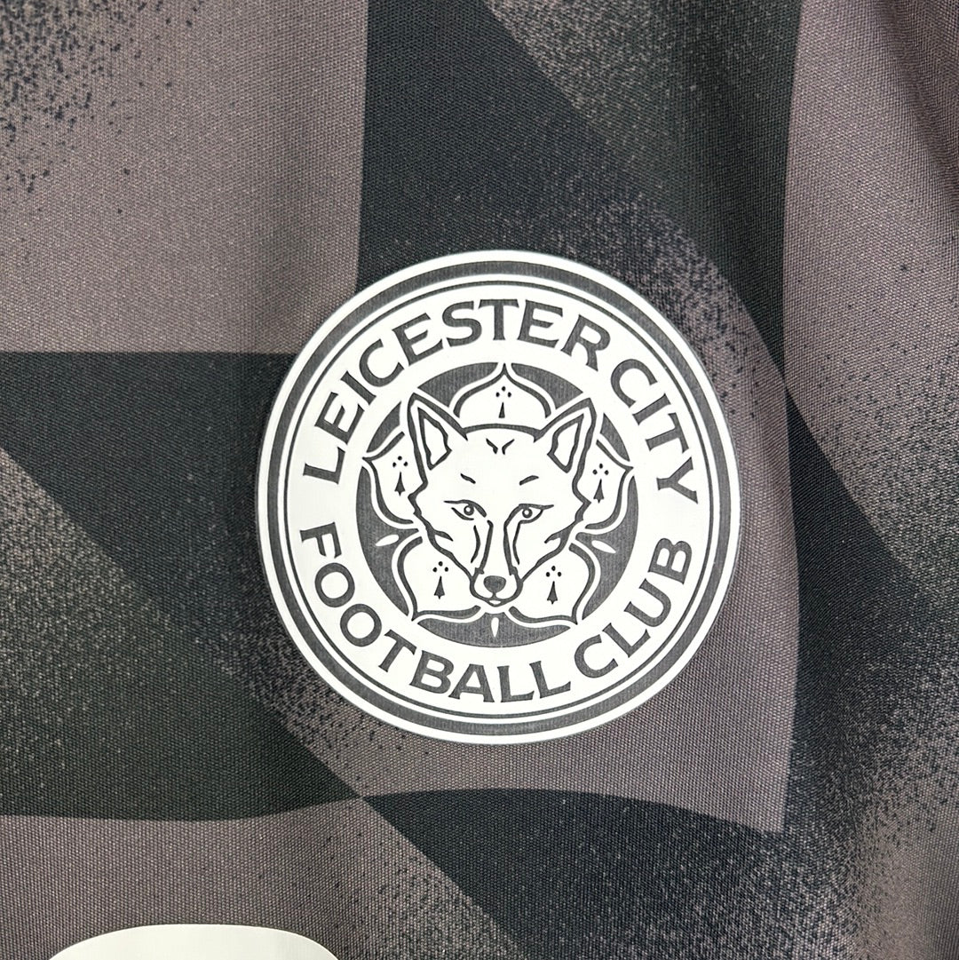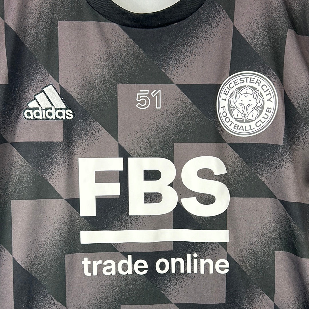 Shirt info: Leicester City's pre-match/warm-up shirt from the 2022/2023 season.  A cool template with black and dark grey patterning. It has the front FBS sponsor. The Adidas logo is embroidered, and the Leicester City badge is heat-pressed.