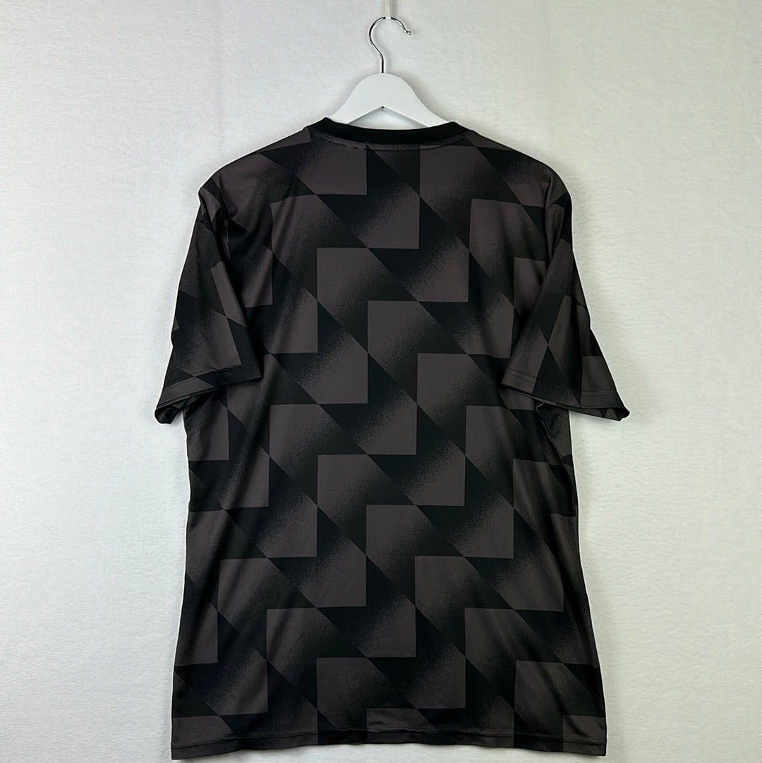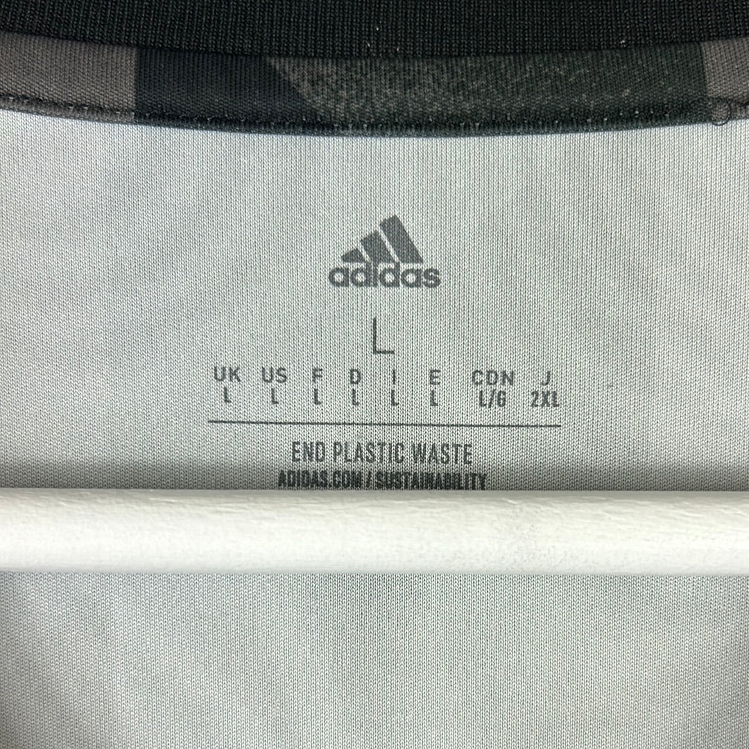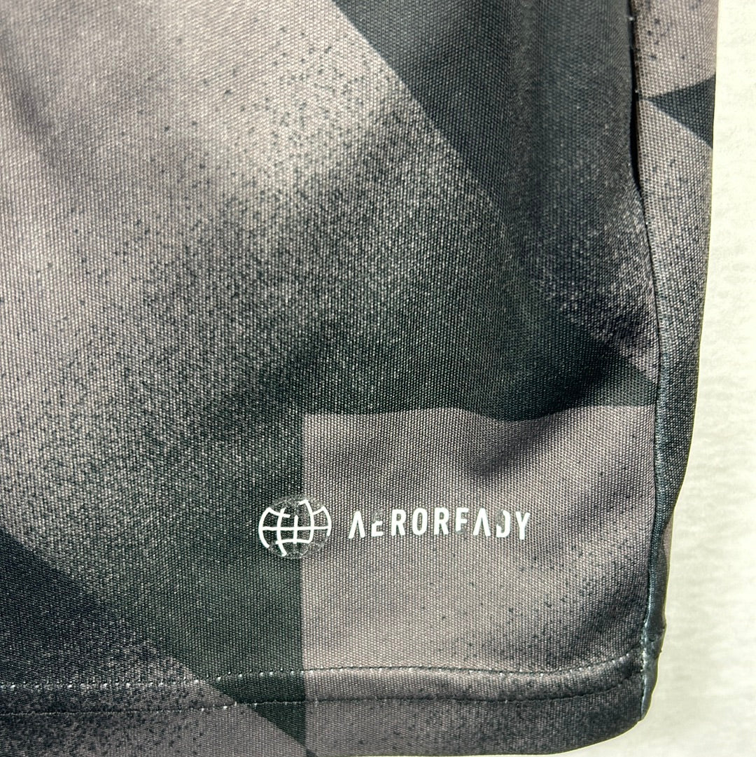 Shirt info: Leicester City's pre-match/warm-up shirt from the 2022/2023 season.  A cool template with black and dark grey patterning. It has the front FBS sponsor. The Adidas logo is embroidered, and the Leicester City badge is heat-pressed.