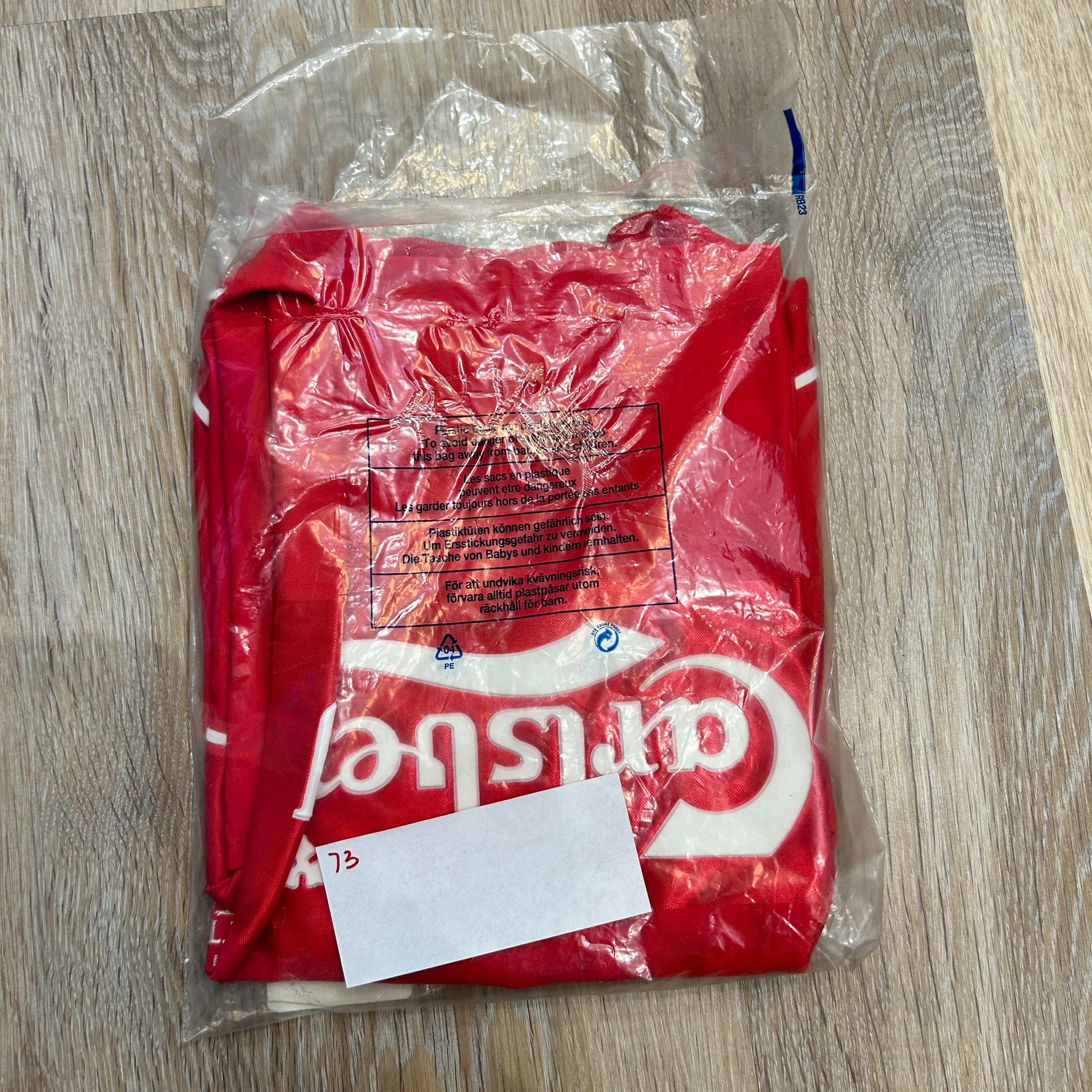 Shirt info: The Liverpool home shirt in the 2000/2001 season. The shirt has the commemorative treble winners embroidery around the badge. The shirt is new with tags and will with the original bag.