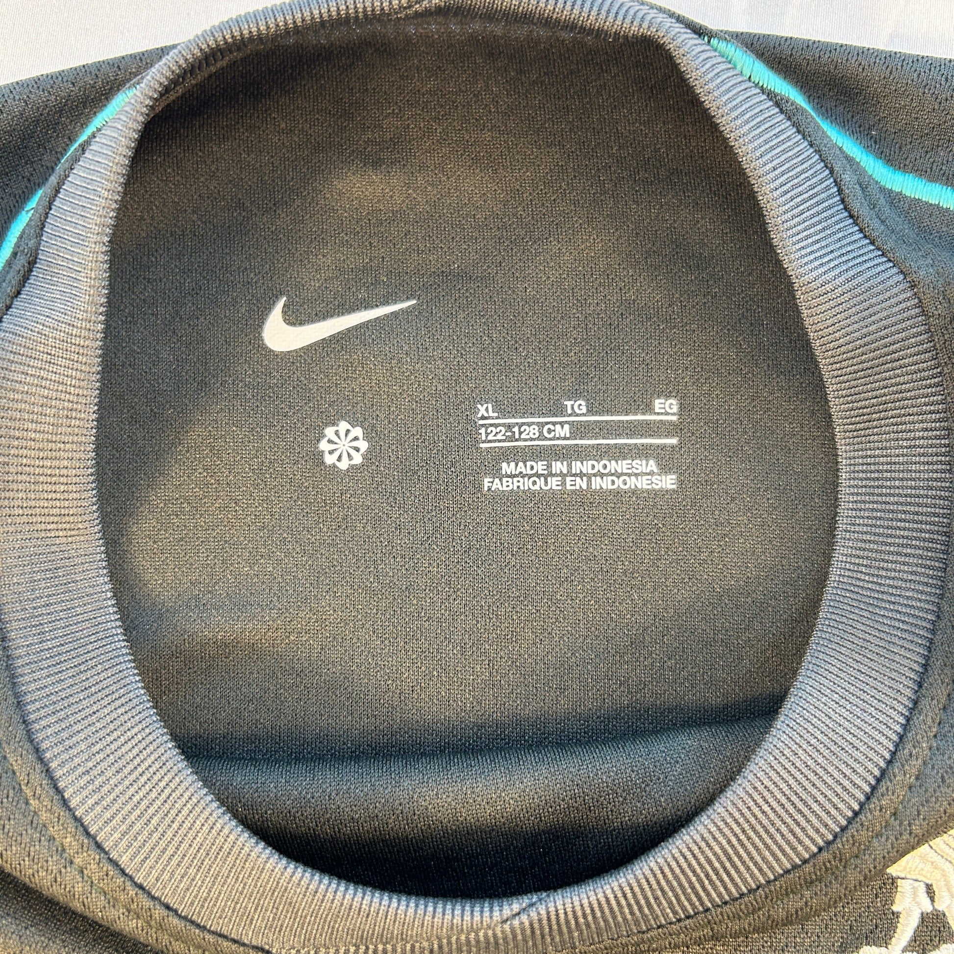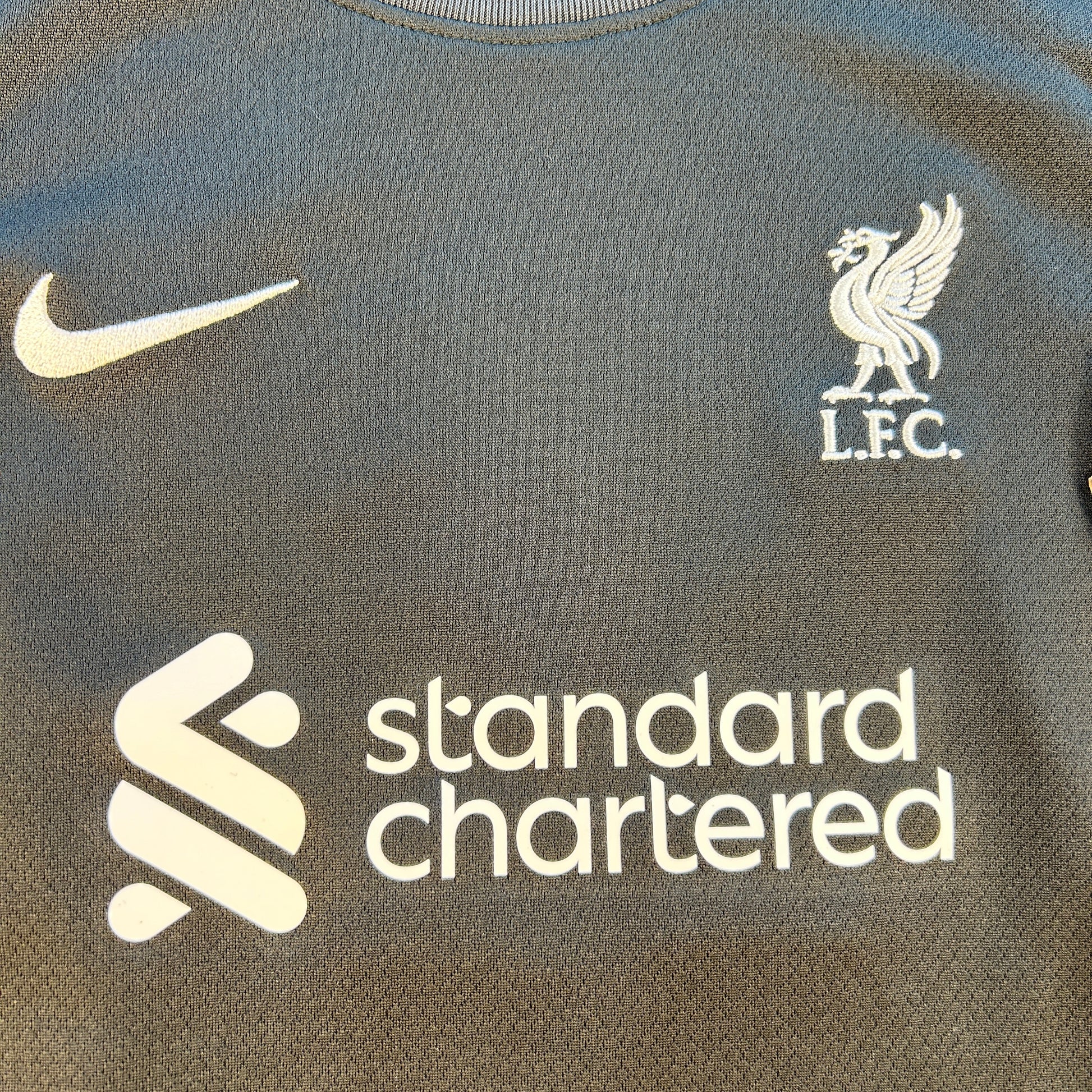 Shirt info: An away shirt for Liverpool in the 24/25 season. This is a cool black shirt with teal and white details.