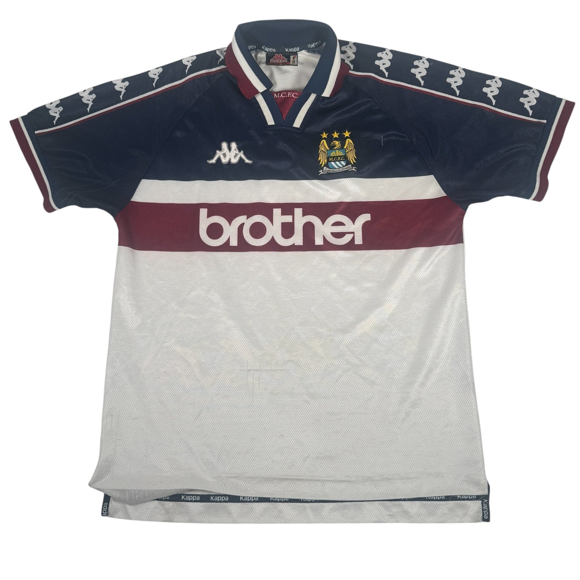Add a classic to your collection with this original Manchester City 1997/1998 away football shirt in adults size Large.