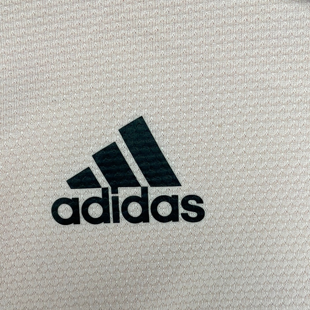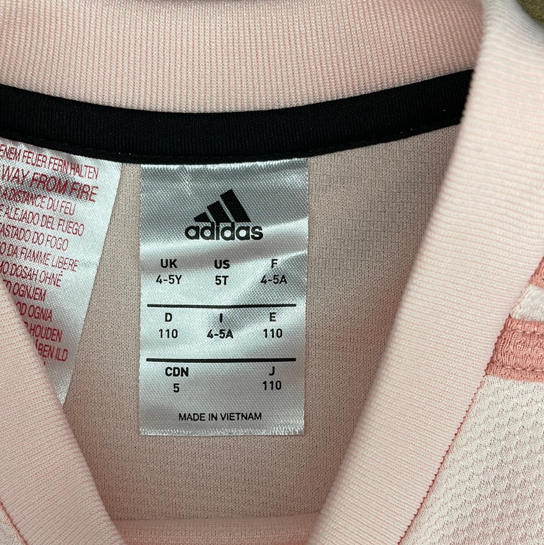 Shirt info: The pink third away from the 2018/2019 season. This is adorable in this size. The Manchester United badge and Adidas logo are printed on this shirt, as is common with small-size kids shirts.