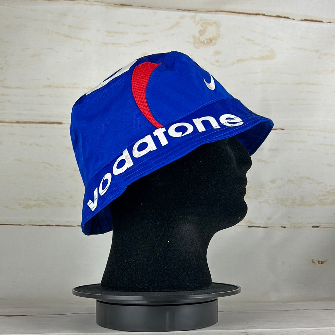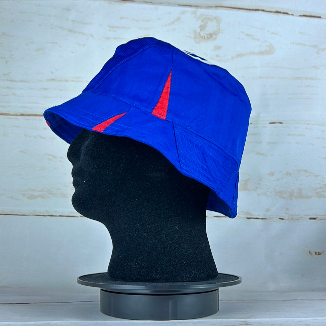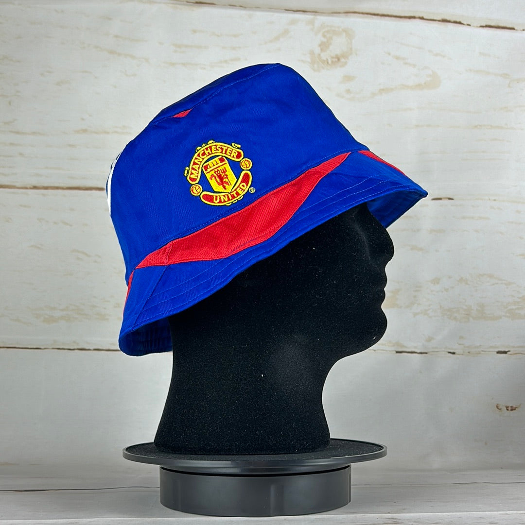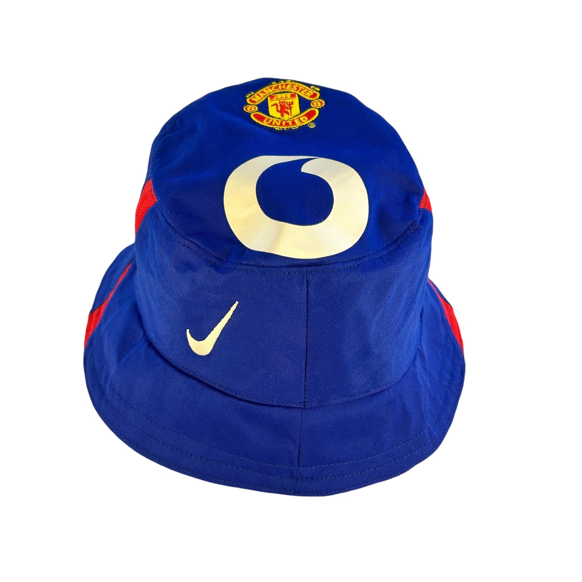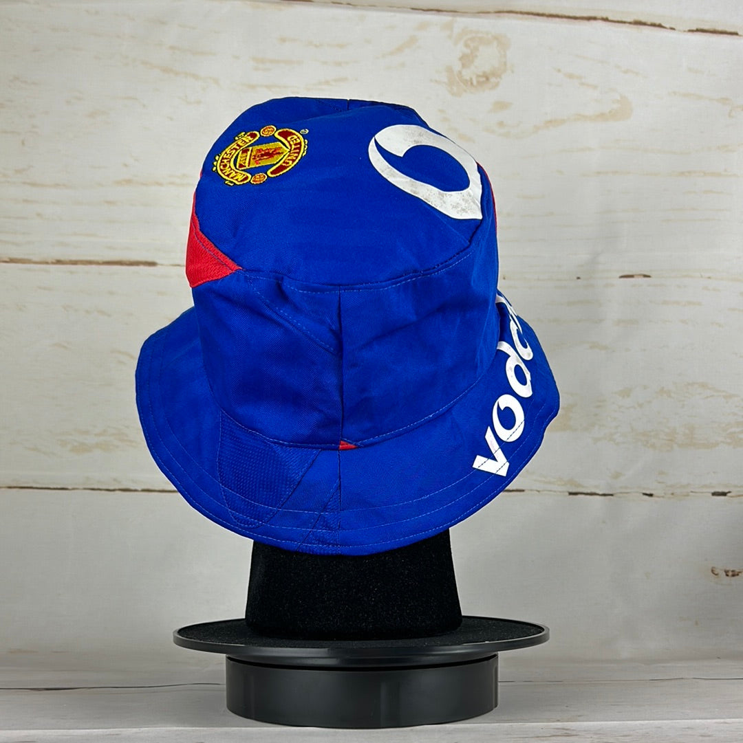 Bucket Hat Info: A custom Manchester United bucket hat that was made from a 2004/2005 away shirt. The hats incorporate the Manchester United badge and Nike swoosh on one side. The top has the Vodafone sponsor on the top. The hat is blue with red parts from he shirt.