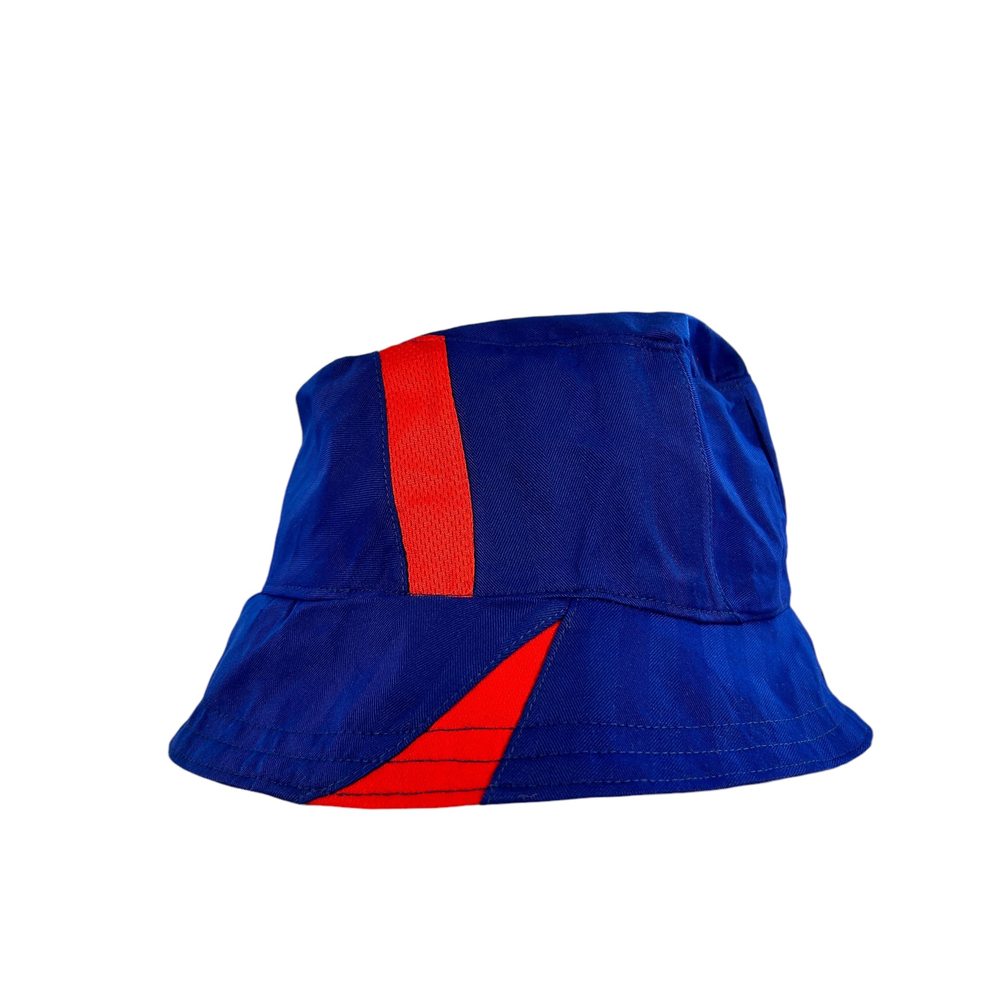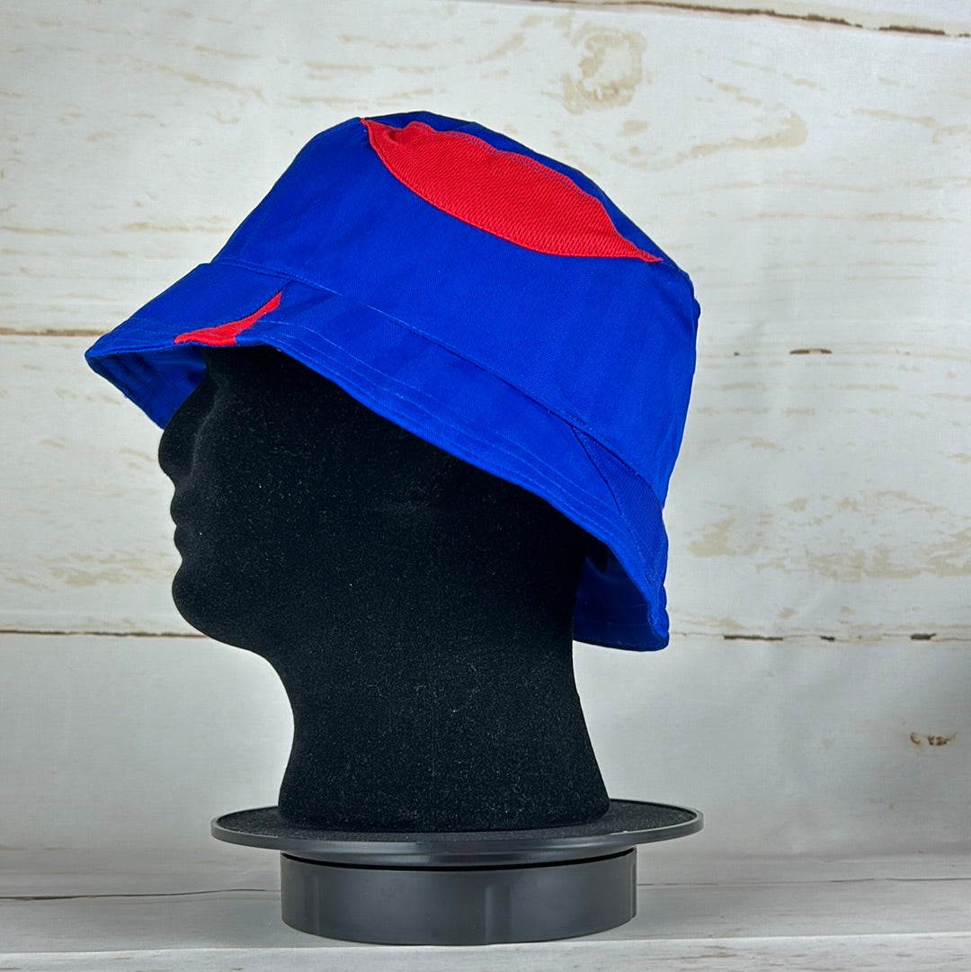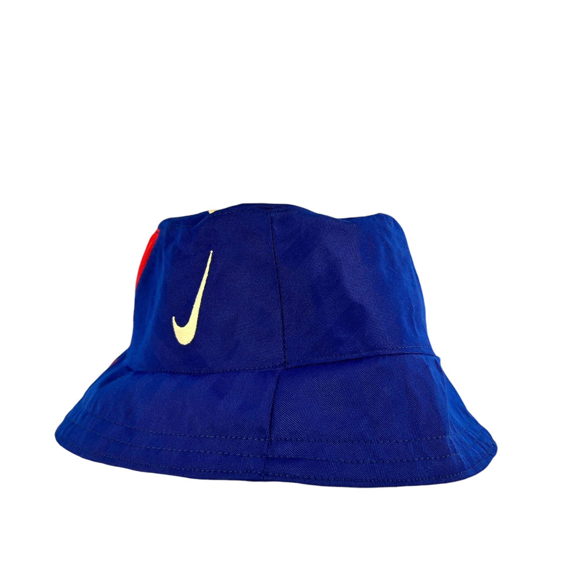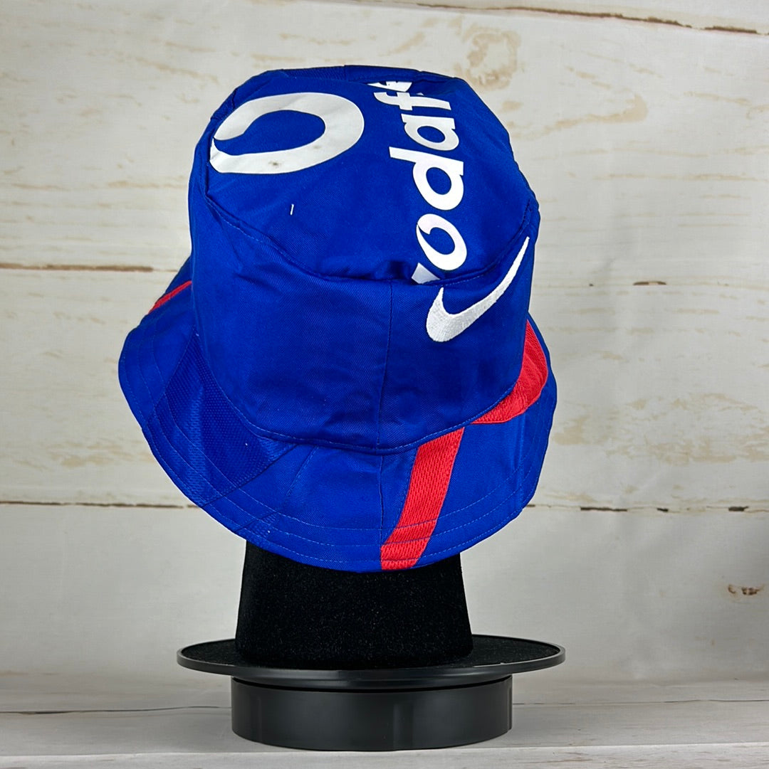 Bucket Hat Info: A custom Manchester United bucket hat that was made from a 2004/2005 away shirt. The hats incorporate the Manchester United badge and Nike swoosh on one side. The top has the Vodafone sponsor on the top. The hat is blue with red parts from he shirt.