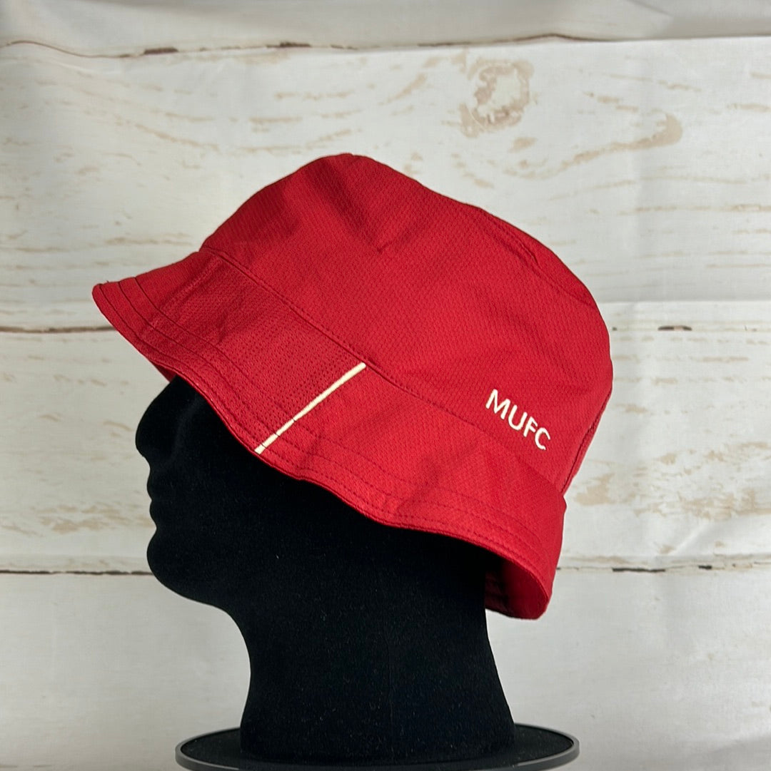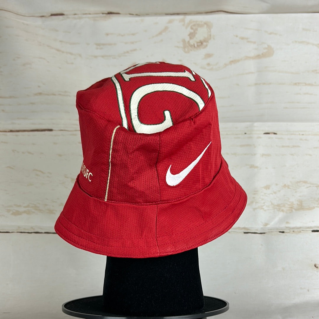Bucket Hat Info: A custom Manchester United bucket hat that was made from a 2006/2007 home shirt. The hat has the United badge, Nike logo and MUFC embroidery on the sides. On the top, it has the AIG sponsor which has some cracking from age, this looks really cool.
