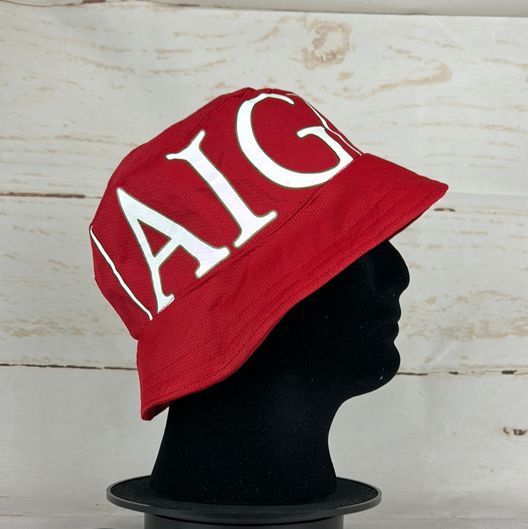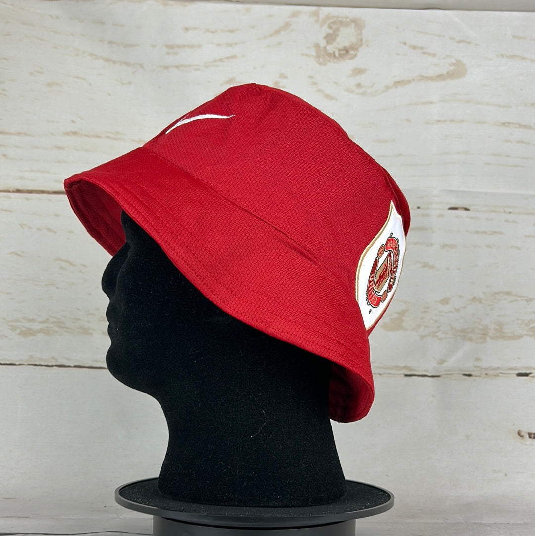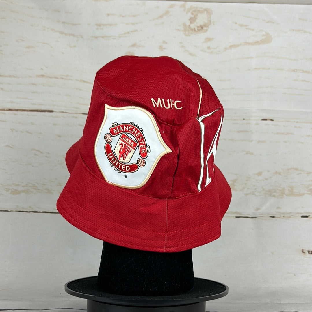 Bucket Hat Info: A custom Manchester United bucket hat that was made from a 2006/2007 home shirt. The hat has the Manchester United badge and Nike swoosh on one side and the AIG sensor on the other. The top has the MUFC embroidery on the lower part of the shirt.