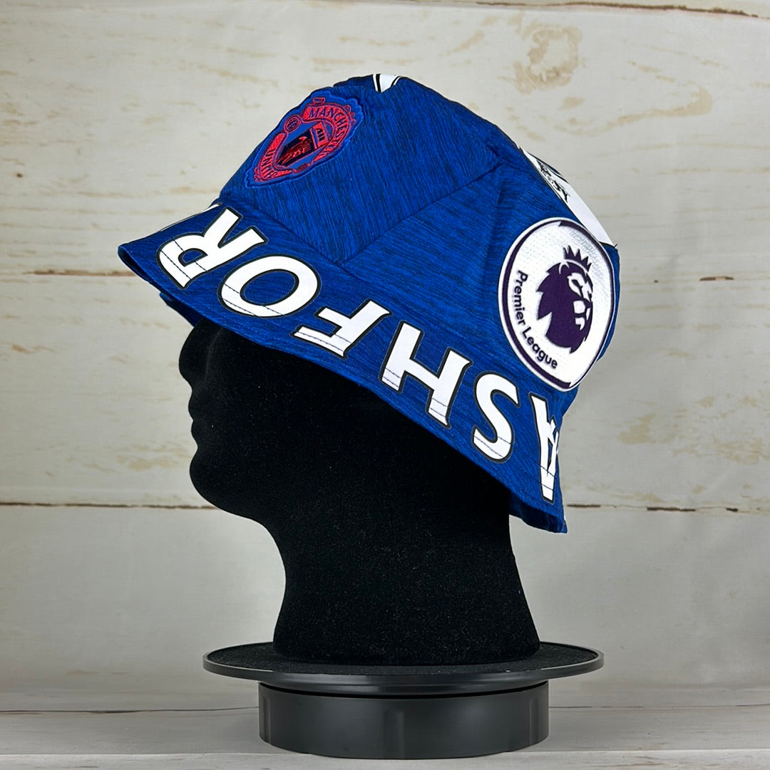 Bucket Hat Info: A custom Manchester United bucket hat that was made from a 2016/2017 away shirt. The hat has the United badge, Adidas logo and print on the side. Select the design options below.