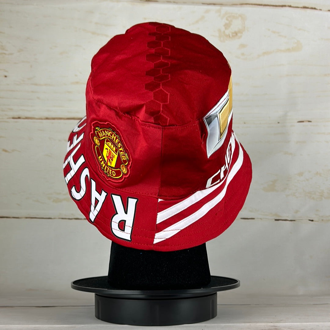 Bucket Hat Info: A custom Manchester United bucket hat that was made from a 2016/2017 home shirt. The hat has the United badge, Adidas logo and Chevrolet print on the side. It also has RASHFORD print on the brim.