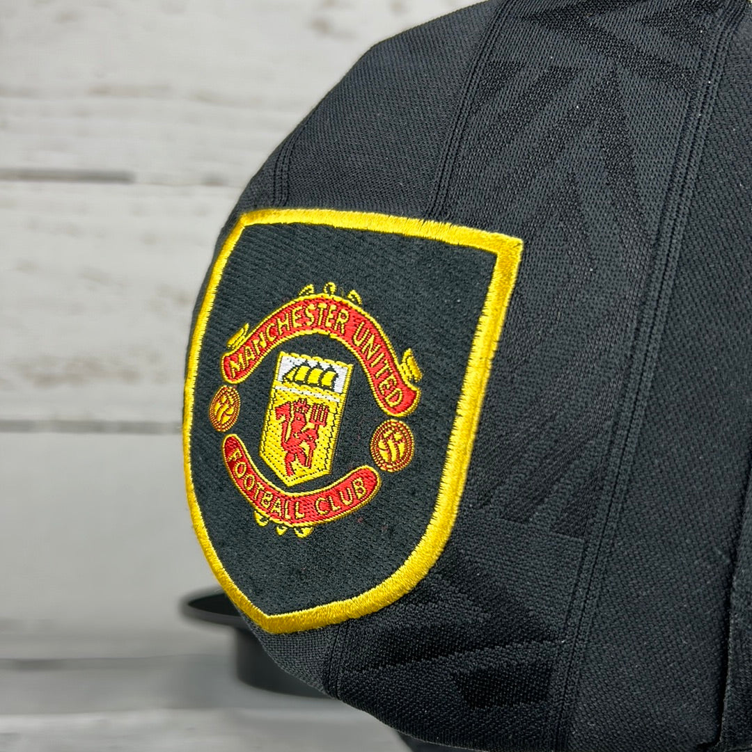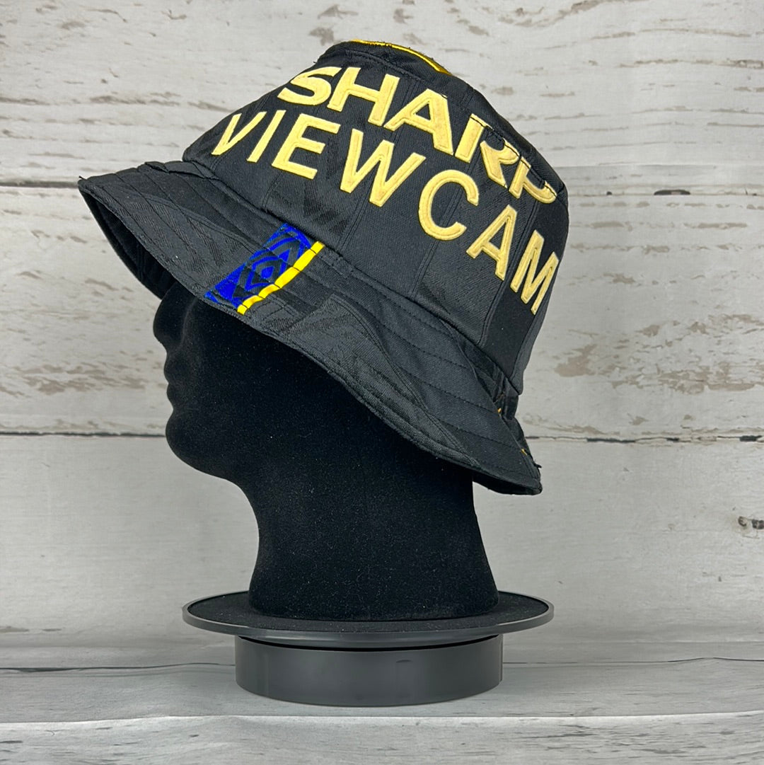 Bucket Hat Info: A custom black Manchetet Unired bucket hat. This has the Sharp Viewcam sponsor on the side and the United badge on the top. The Umbro tag and print are also on the outside. The MUFC tag on the sleeve has also been incorporated on the outside of the hat.