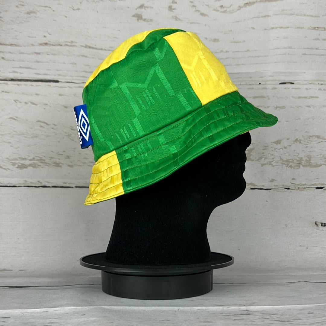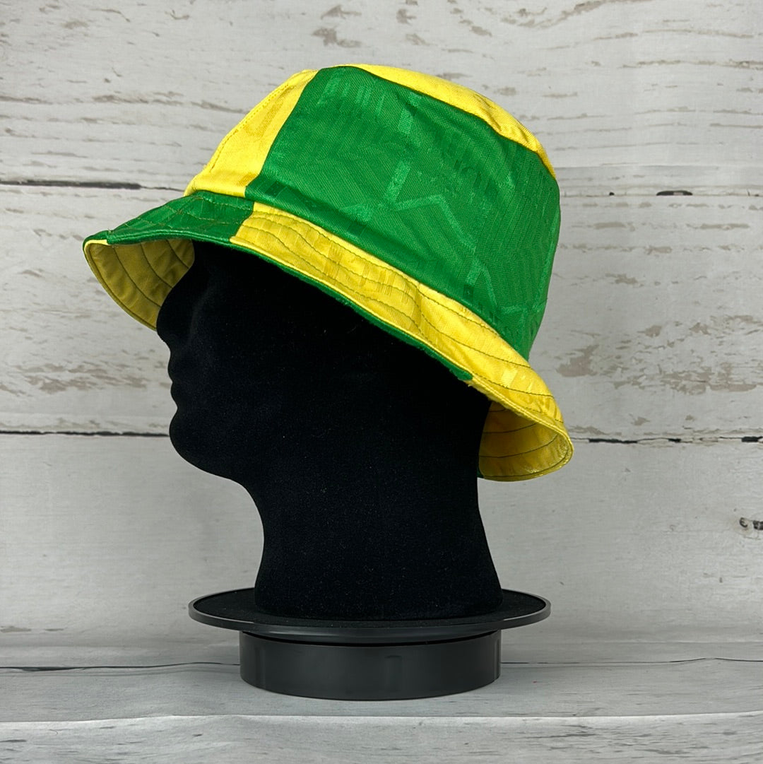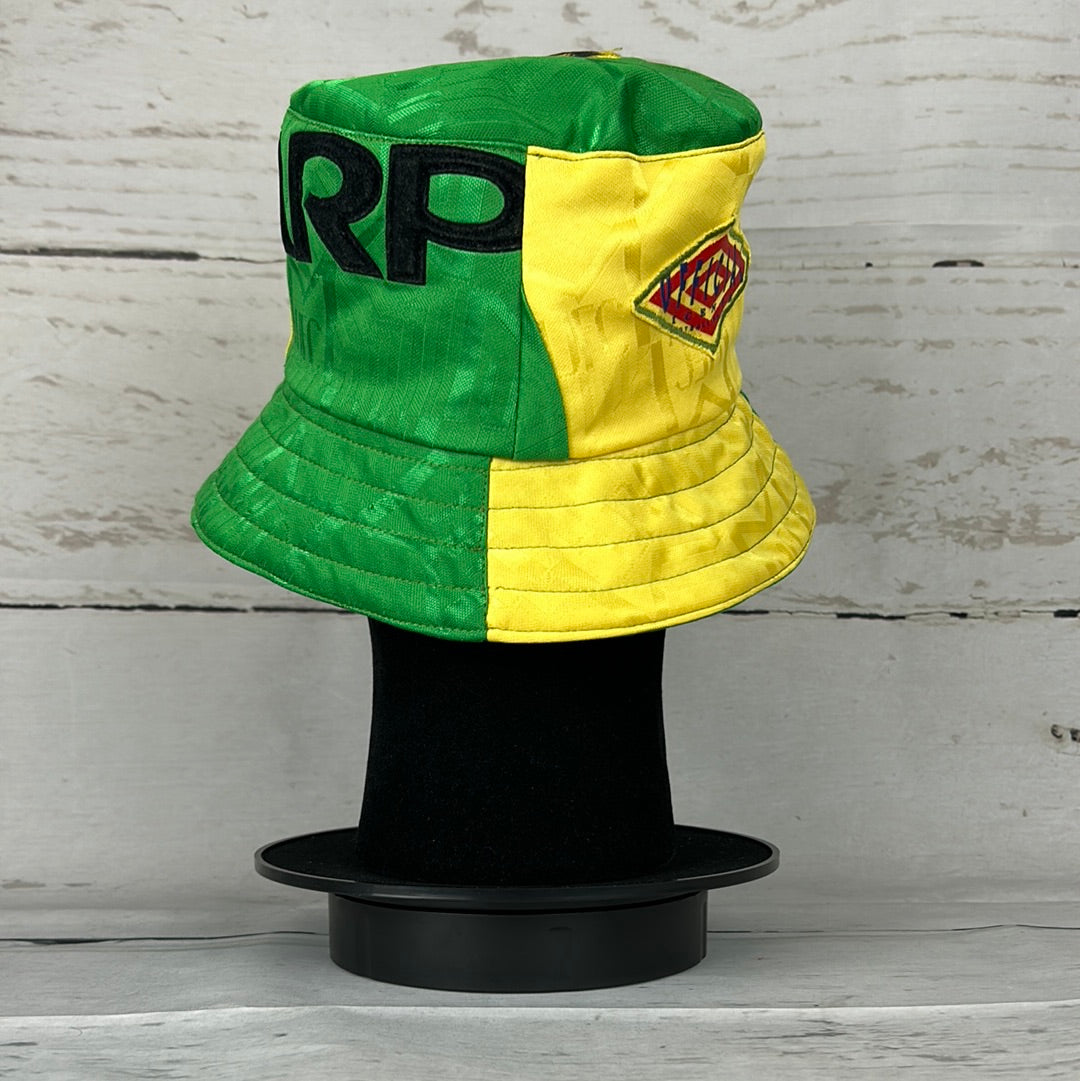 Bucket Hat Info: A custom green and gold Manchester United bucket hat. This is made from a damaged authentic 1993 third shirt.