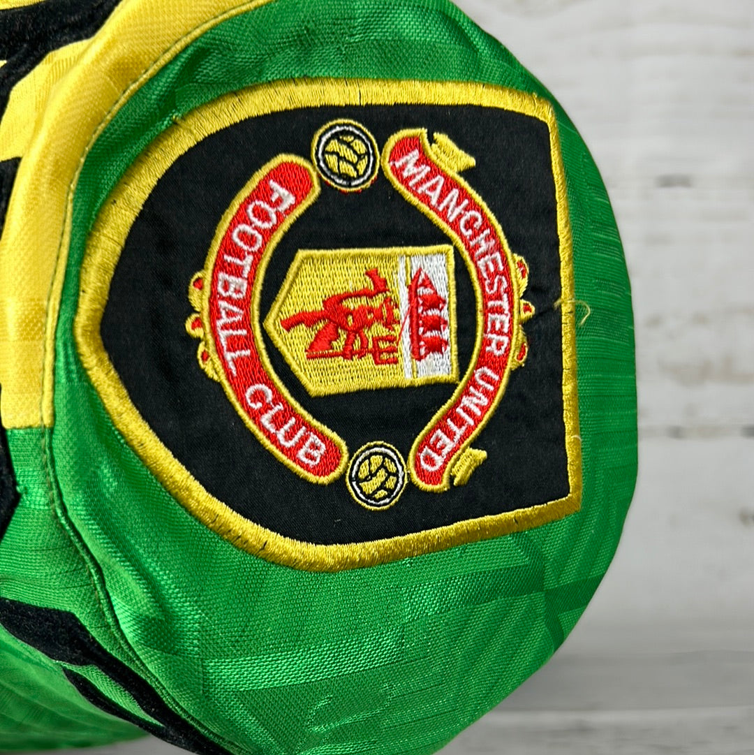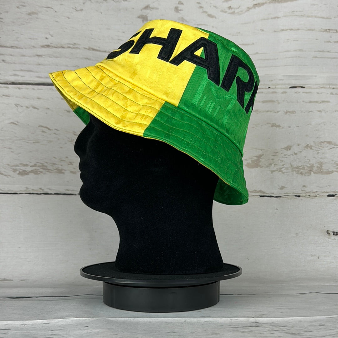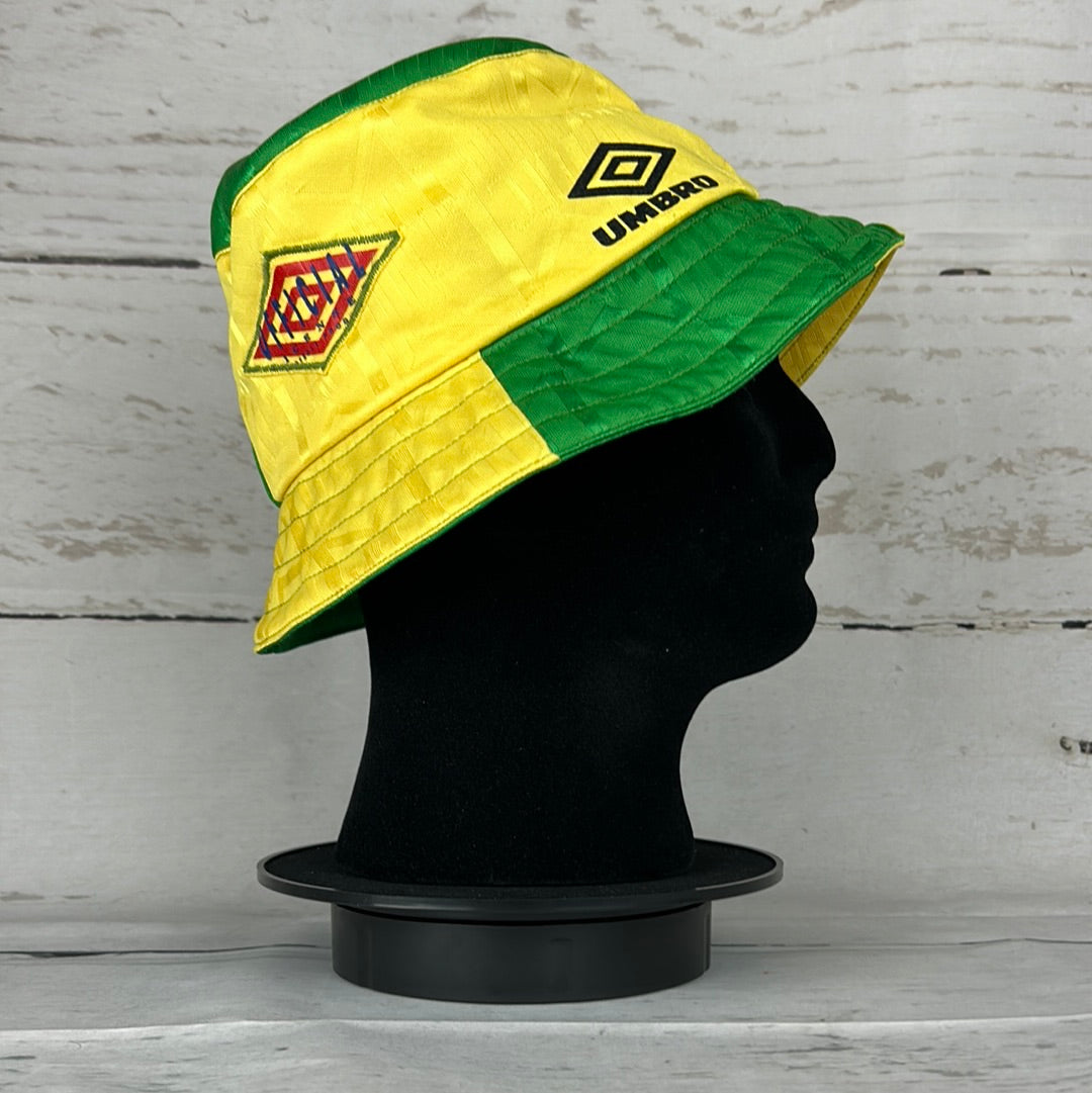 Bucket Hat Info: A custom green and gold Manchester United bucket hat. This is made from a damaged authentic 1993 third shirt.