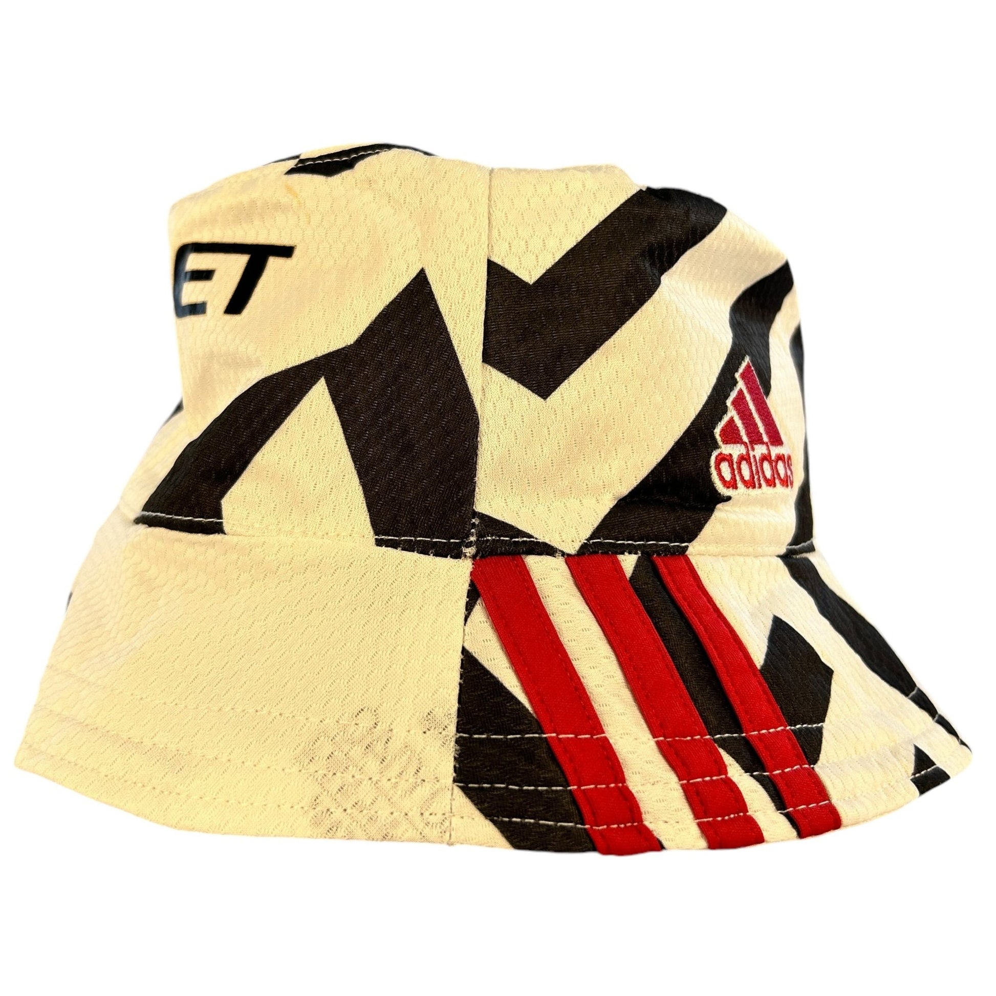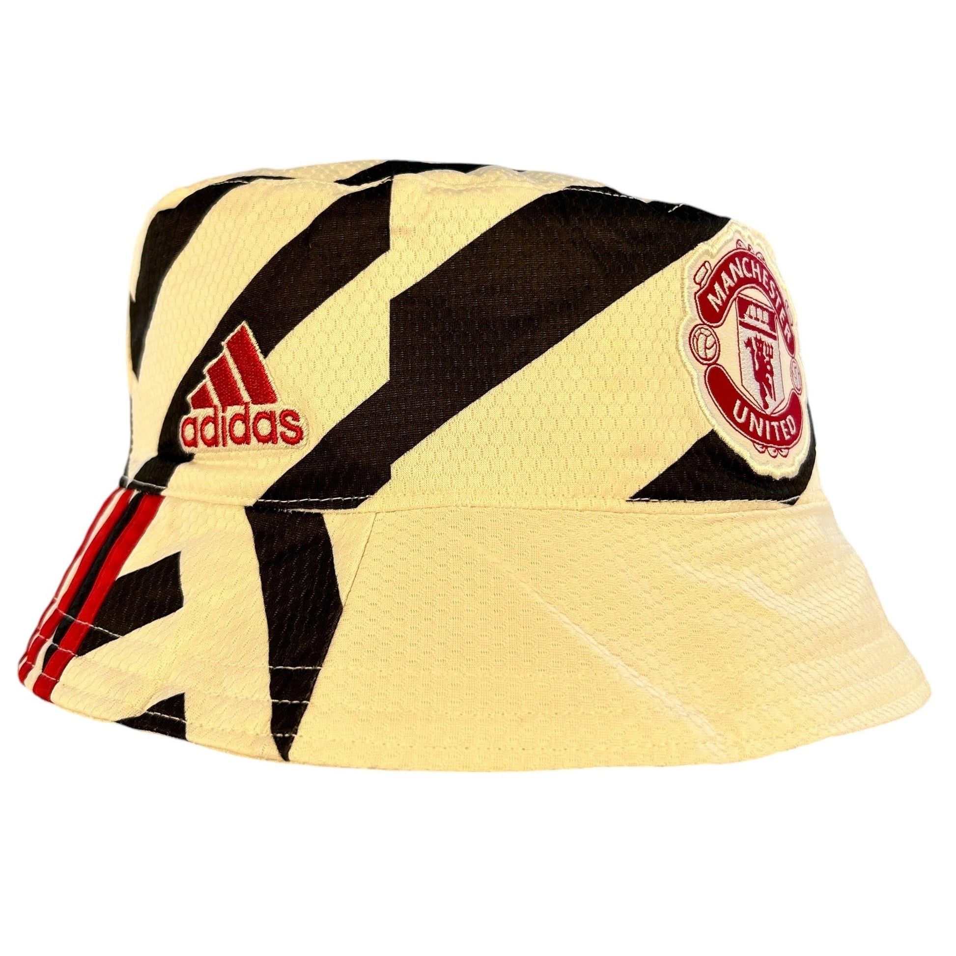 Bucket Hat Info: This custom Manchester United bucket hat was made from a 20/21 third shirt. The urban zebra style design means this shirt makes a fantastic bucket hat. The hat has the United badge and Adidas logo on one side. The other side has the Chevrolet sponsor. The brim has the red Kohler sleeve sponsor.