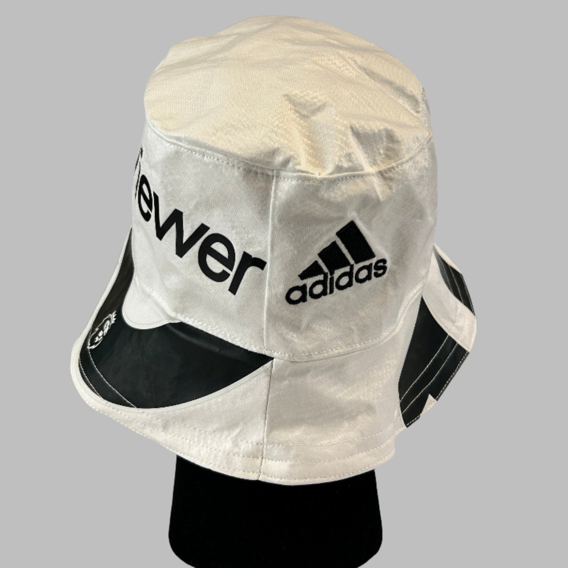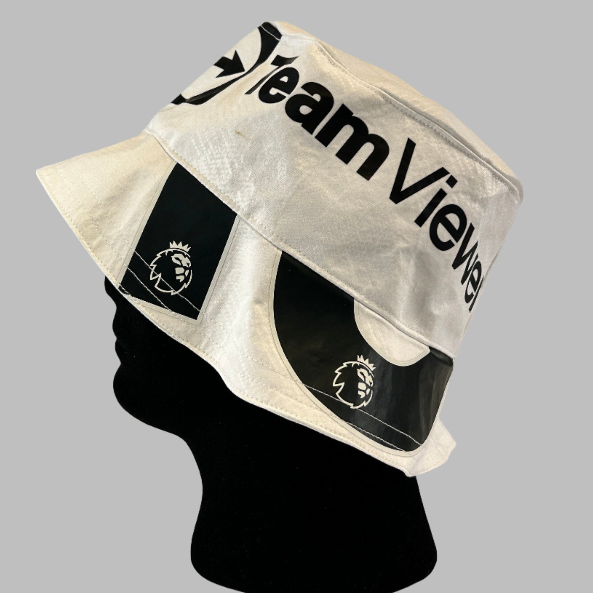 Bucket Hat Info: A custom upcycled bucket hat made from an authentic Manchester United football shirt. The white bucket hat features; the Man United badge, the Adidas logo and the black 'Team Viewer' sponsor and part of the number 10 print on the brim.