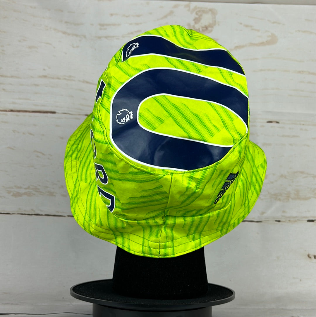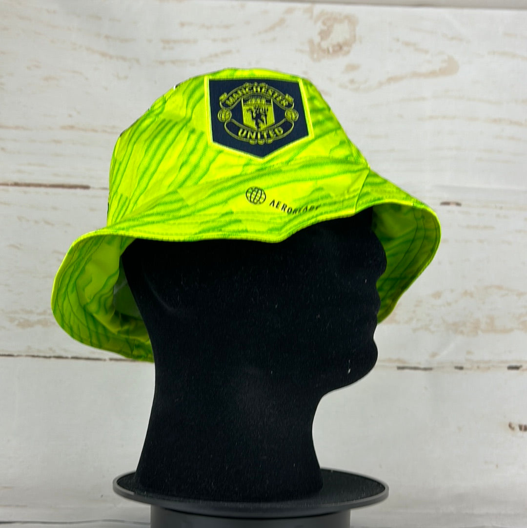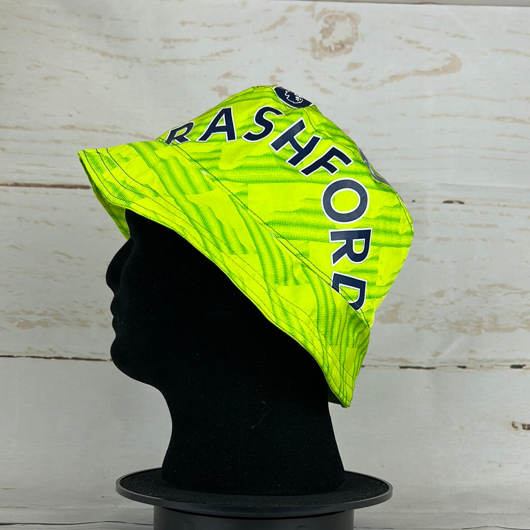 Bucket Hat Info: A custom Manchester United bucket hat that was made from a 2022/2023 green third shirt. The hat has the Manchester United badge and Adidas logo on the side - The Adidas is smaller as it is from a child-size shirt. The other side has RASHFORD from the back and the 10 is on the top.
