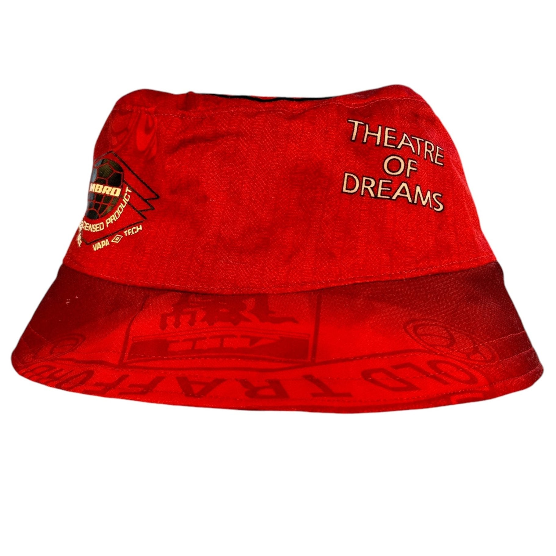 Bucket Hat Info: A 1997/1998 Manchester United home shirt. The hat has the United badge on top, as well as some of the Sharp sponsors. The sides have the Umbro print and Theatre Of Dreams.