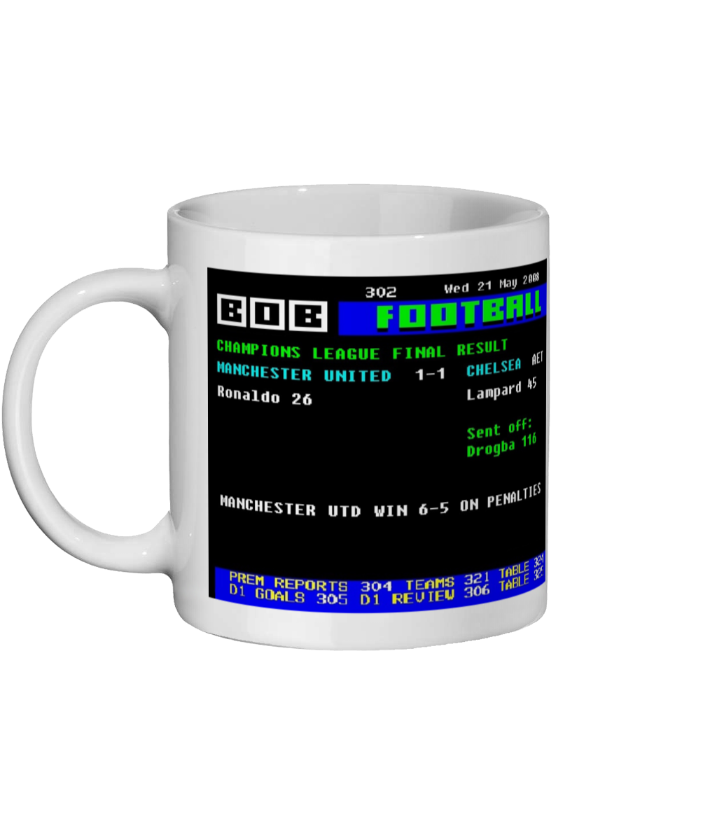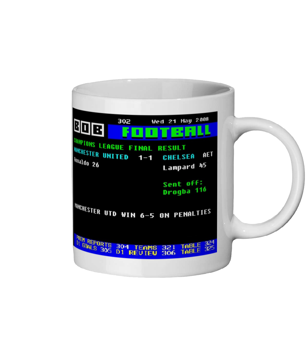 This 11oz ceramic mug is adorned with a Teletext design celebrating the intense 2008 Champions League Final between Manchester United and Chelsea. This unforgettable match, held in Moscow, ended in a 1-1 draw after extra time, leading to a nail-biting penalty shootout which Manchester United won 6-5. The design features key moments, including Cristiano Ronaldo's opening goal and Edwin van der Sar's heroic save from Nicolas Anelka's penalty. This mug is a must-have for any Manchester United supporter, capturing the spirit and triumph of one of their most dramatic European victories.
