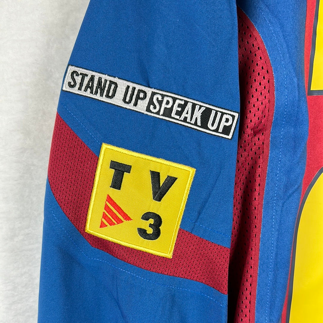 Player Issue Details: The shirt is a correct player-issue shirt with no internal labels, correct for a Nike player-issue shirt at this time. The Barcelona badge has additional stitching holding it in place. The shirt has unique Stand Up Speak Up sleeve patches.
