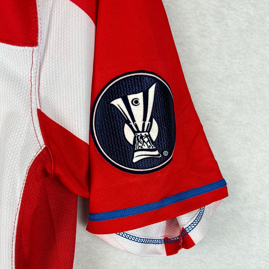 Player Issue Details: Original player issue shirt. The shirt has no product code label and printed wash instructions, correct for a player's shirt. The shirt has the Europa League patch on one sleeve. It has a plain white panel on the back of the shirt to keep in line with the UEFA rulings on shirts at the time.