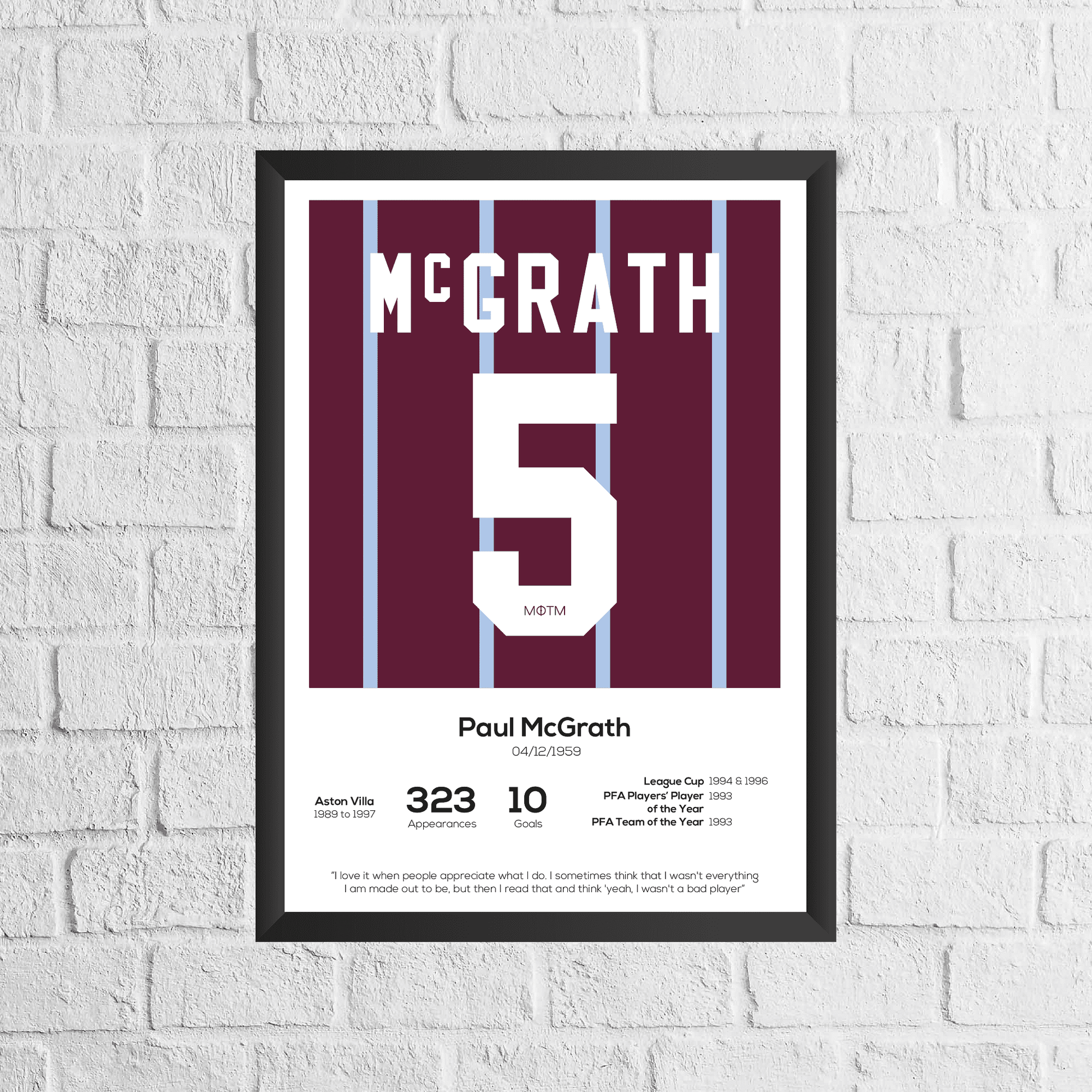 Remember the amazing Villa career of Irish centre back and cult icon, Paul McGrath. McGrath spent eight seasons at Villa Park, making 323 appearances and his name is still chanted by the Villa faithful. This high quality Paul McGrath print is the perfect gift for any Villa fan.
