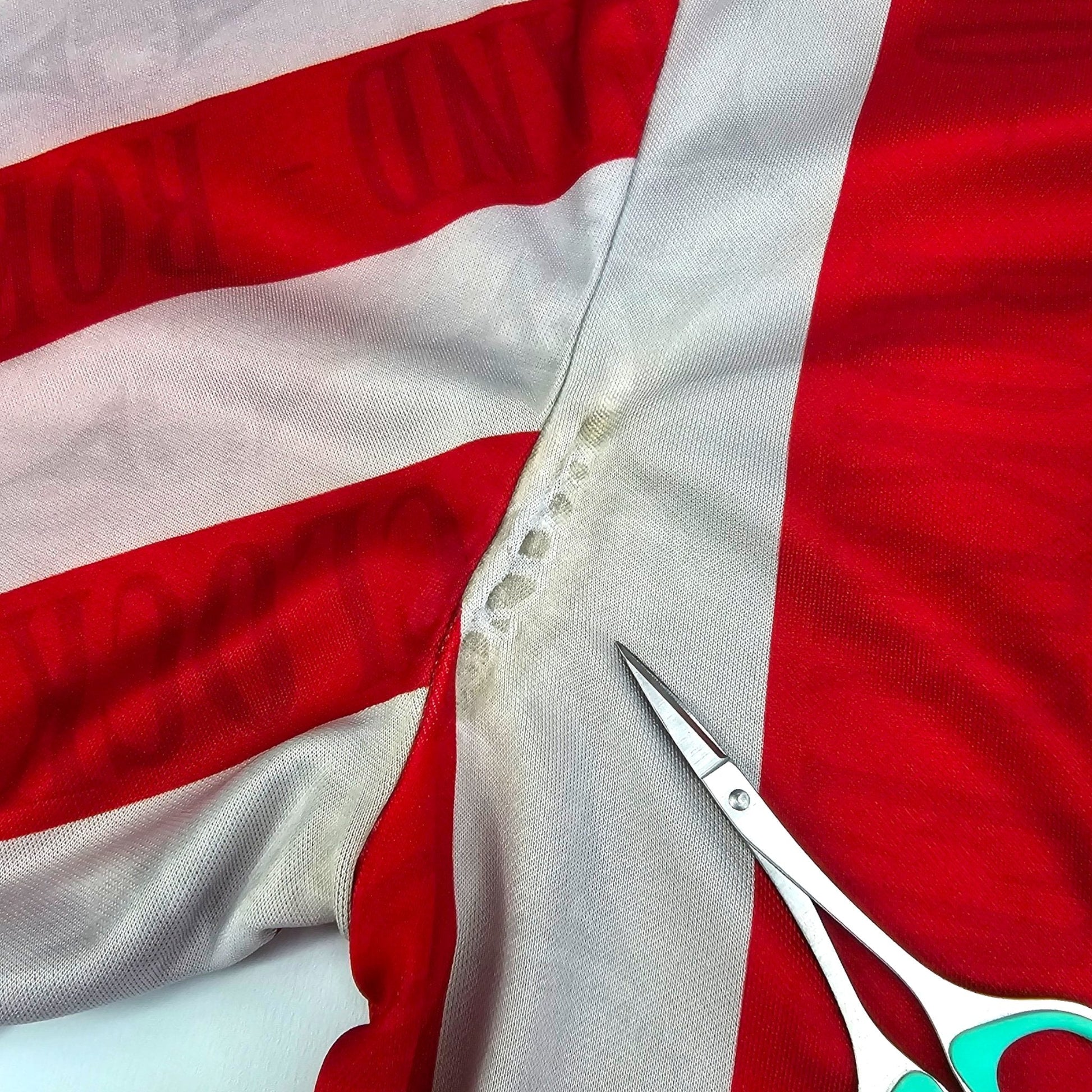 Condition: Very Good. Good colours, material is smooth with a few bobbles, marks and pulls, one longer pull above hem on tail of shirt (see photo). Small damaged section to rear of left sleeve/armpit (see photo).  No tears or holes. Manufacturer logo shows light wear whilst stitched team badge is superb. Sublimated chest sponsor is in excellent. Collar, sleeves and hem are in fabulous condition.