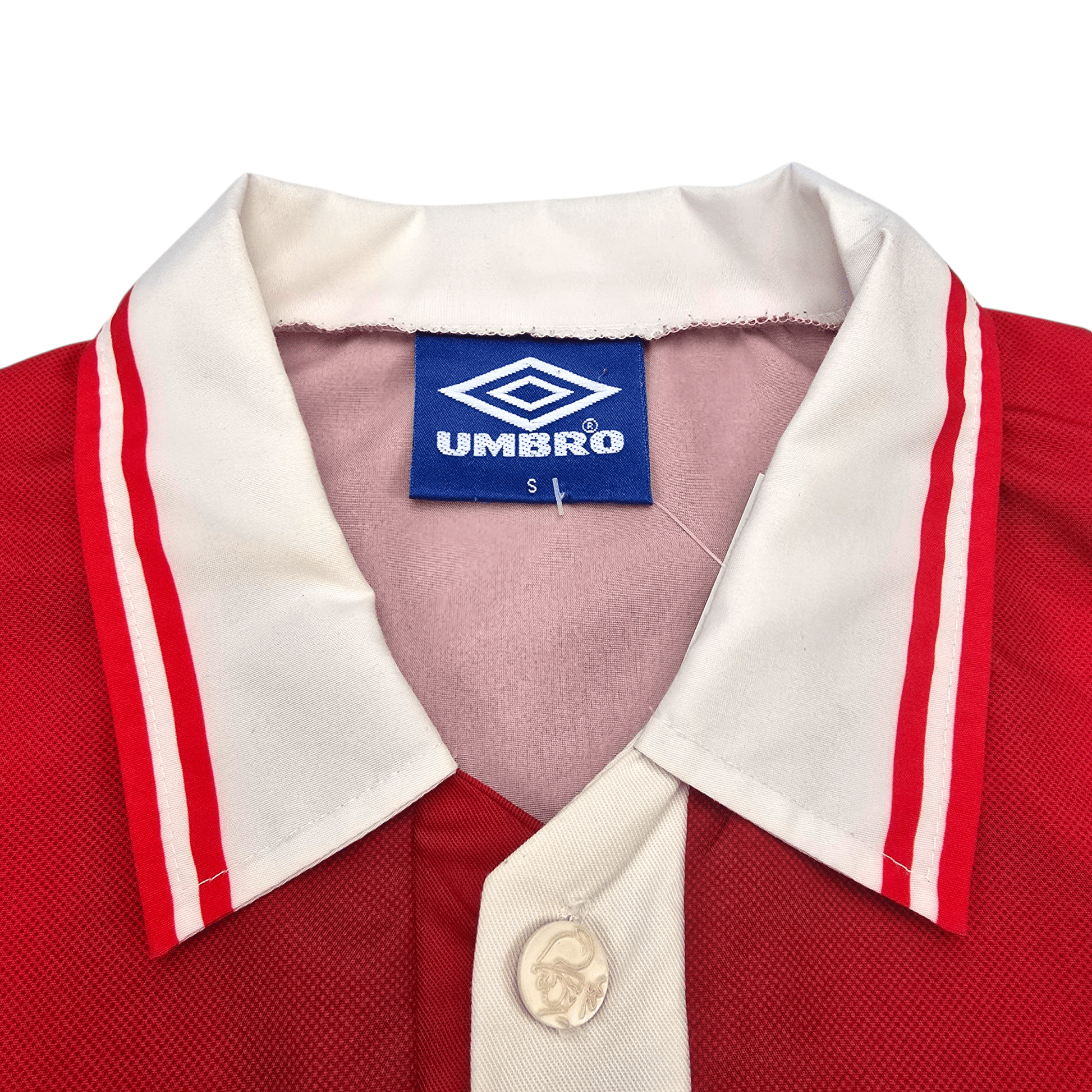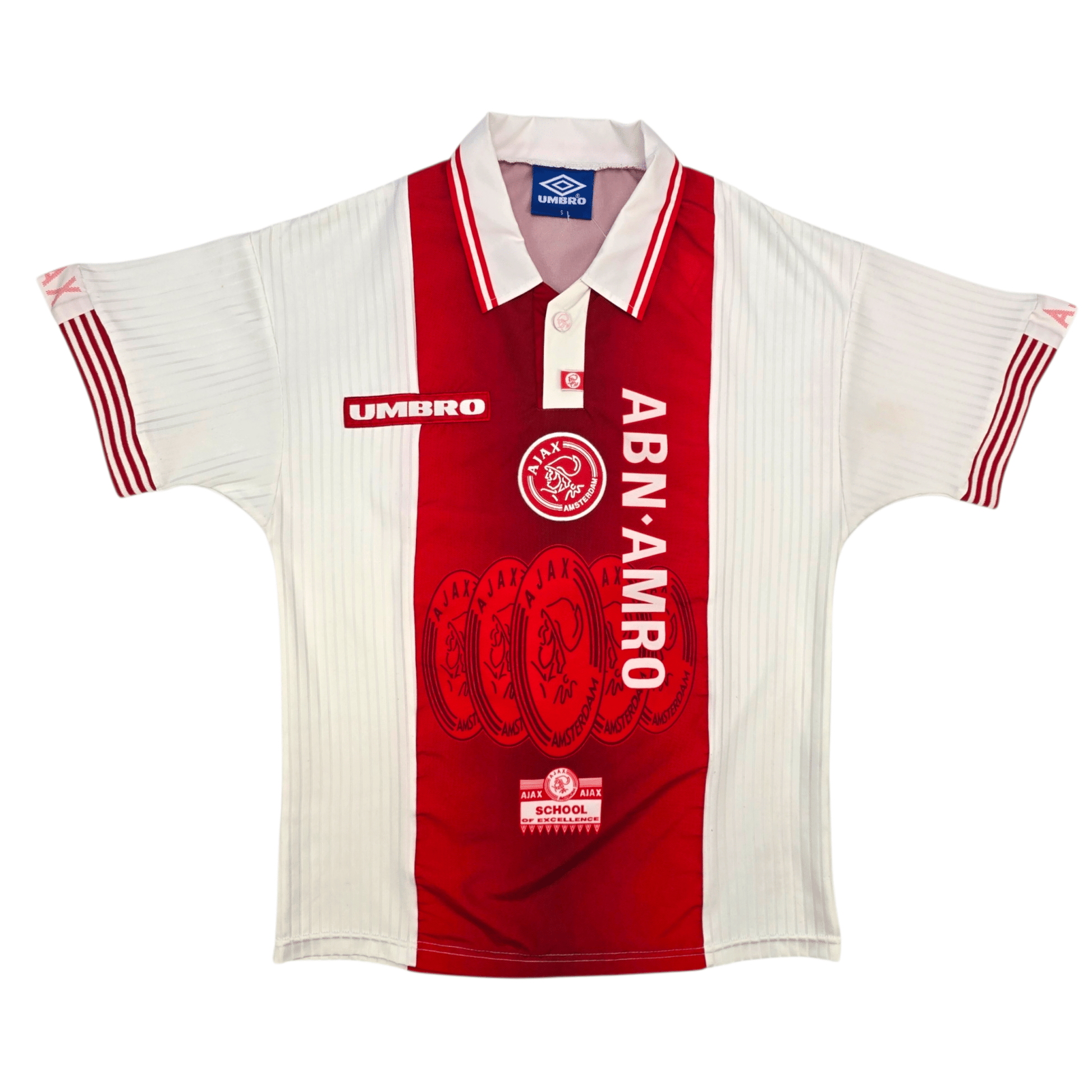 Information: Official Umbro Ajax home football shirt, as worn by ‘de Godenzonen’ during the 1997/98 season, when the side won both the Eredivisie and the KNVB Cup under Morten Olsen, completing a dominant domestic double with a talented, attack-minded squad. A fantastic vintage jersey, ideal for a collection of your own or the perfect gift for any football fan.
