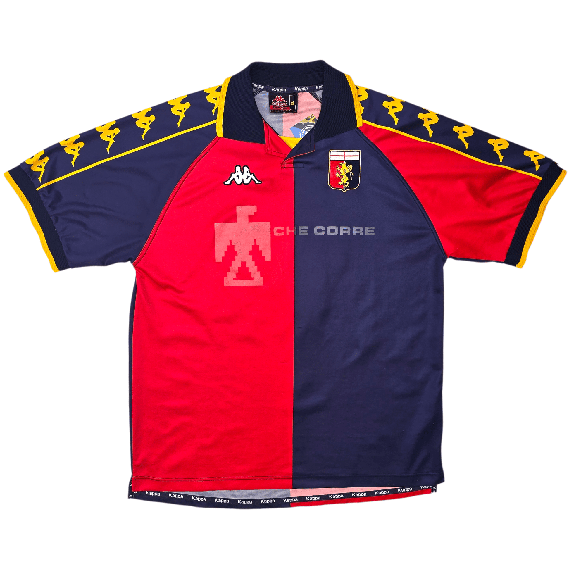 Information: Official Kappa Genoa home football shirt, as worn by ‘Il Grifone’ during the 2000/01 season, when the side lifted the Serie B title to secure promotion back to Serie A after a commanding league campaign. The reverse of the shirt boasts the nameset of club legend, Gianluca Malagò. A fantastic vintage jersey, ideal for a collection of your own or the perfect gift for any football fan.