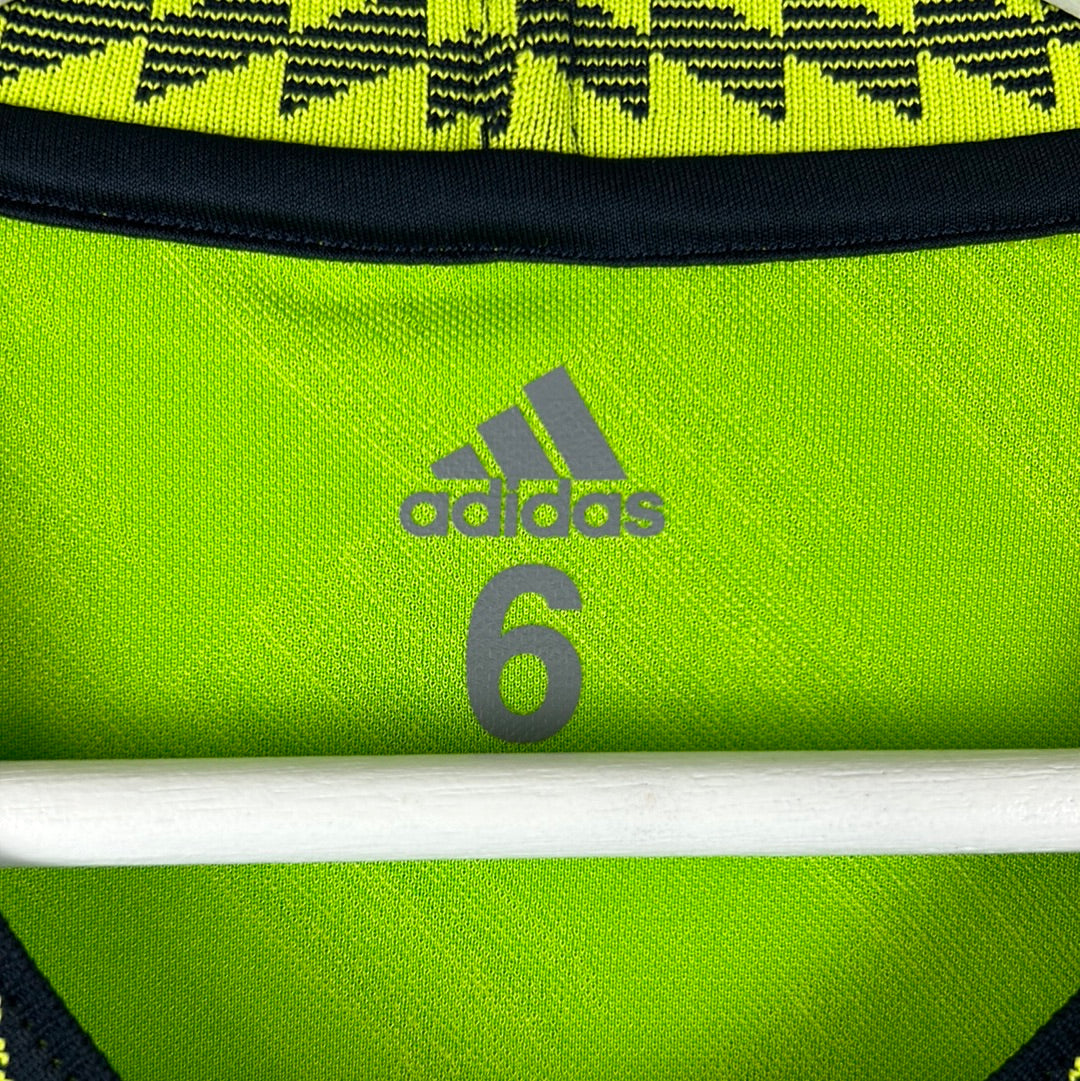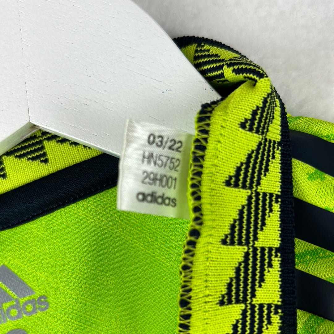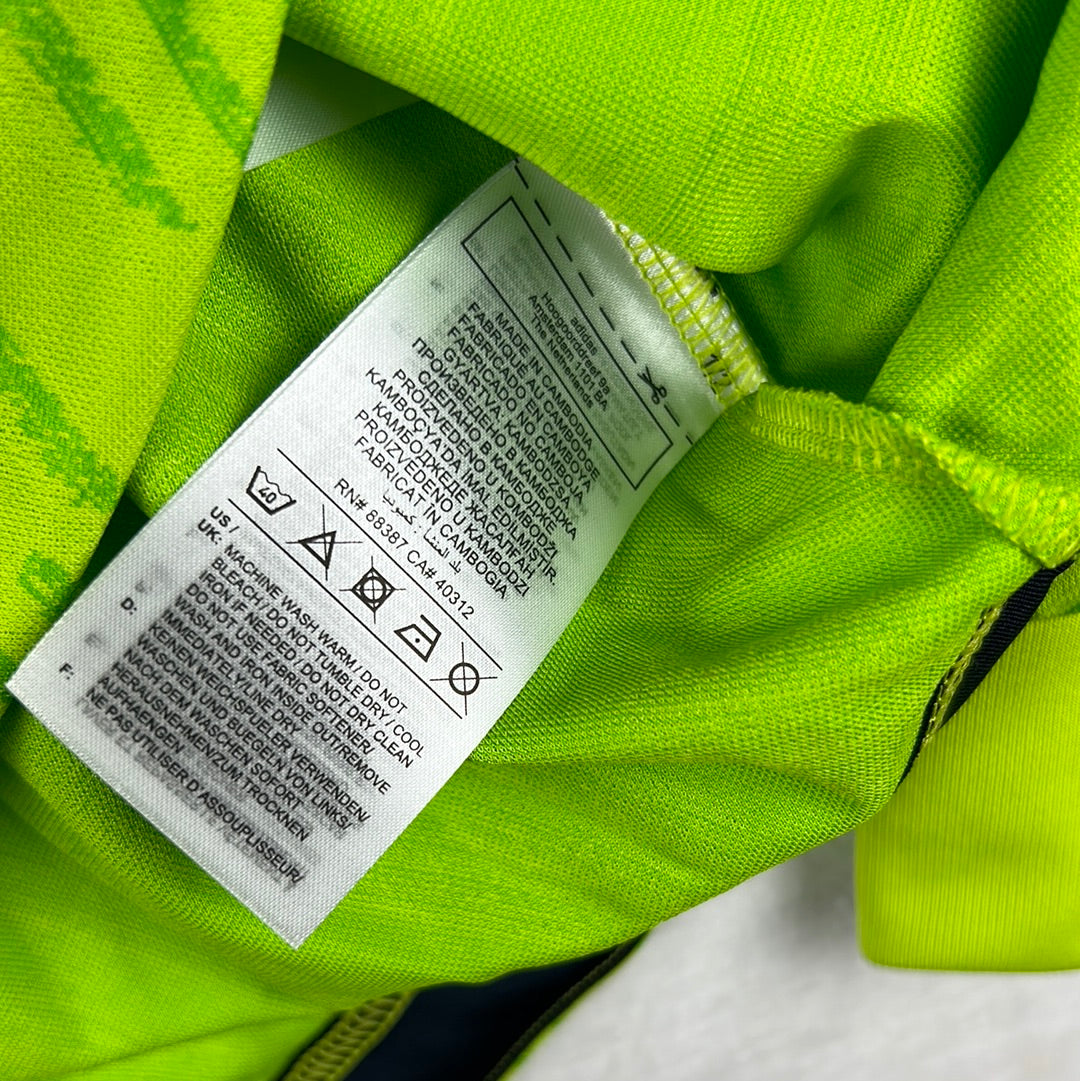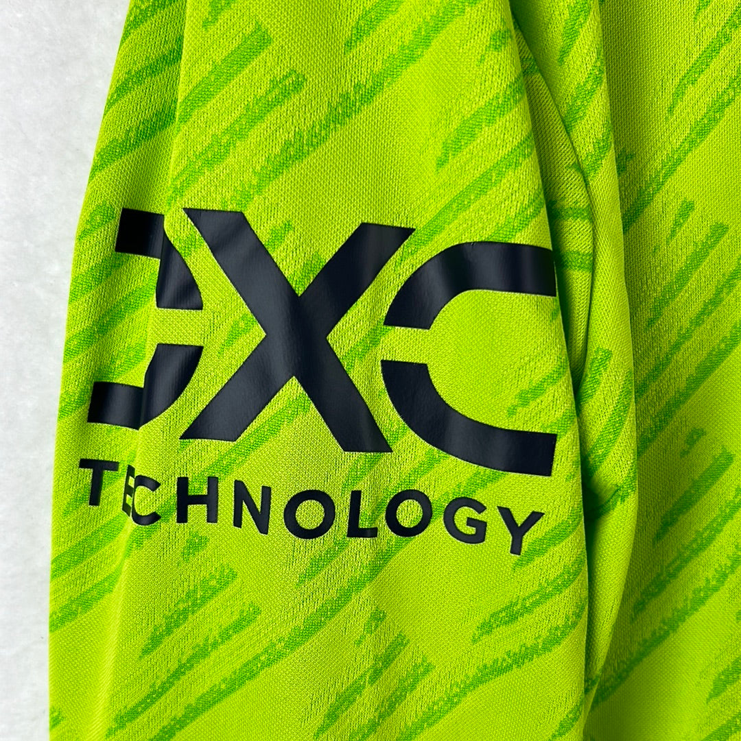 Shirt info: An authentic player-issue goalkeeper away shirt for Ronaldo at Manchester United. It has the cup font print. The shirt has a different feel to the material than the standard shirt. It has a printed Manchester United badge and Adidas logo. It is sized 5 inside the neck. The DXC logo is printed higher up the sleeve than on the replica shirts. This is a rare long sleeve version of the shirt.