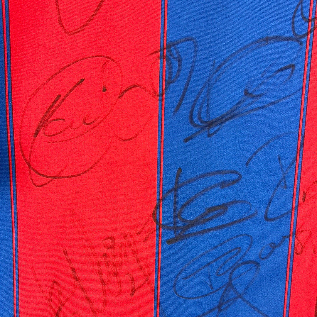 Shirt info: A Barcelona home shirt in the 2002/2003 season. The shirt has been signed by the squad in black marker pen.