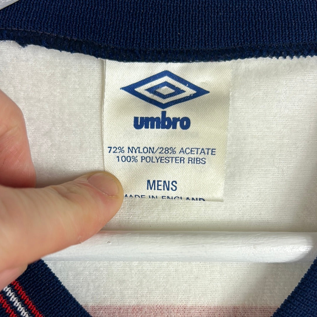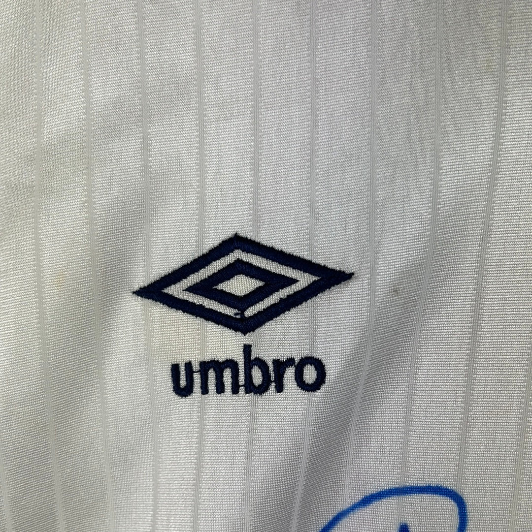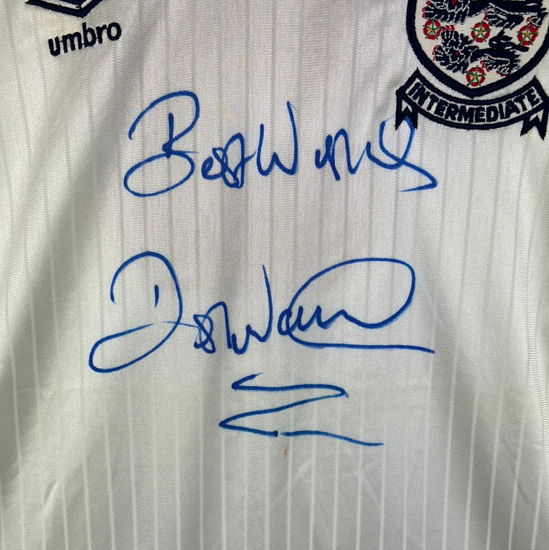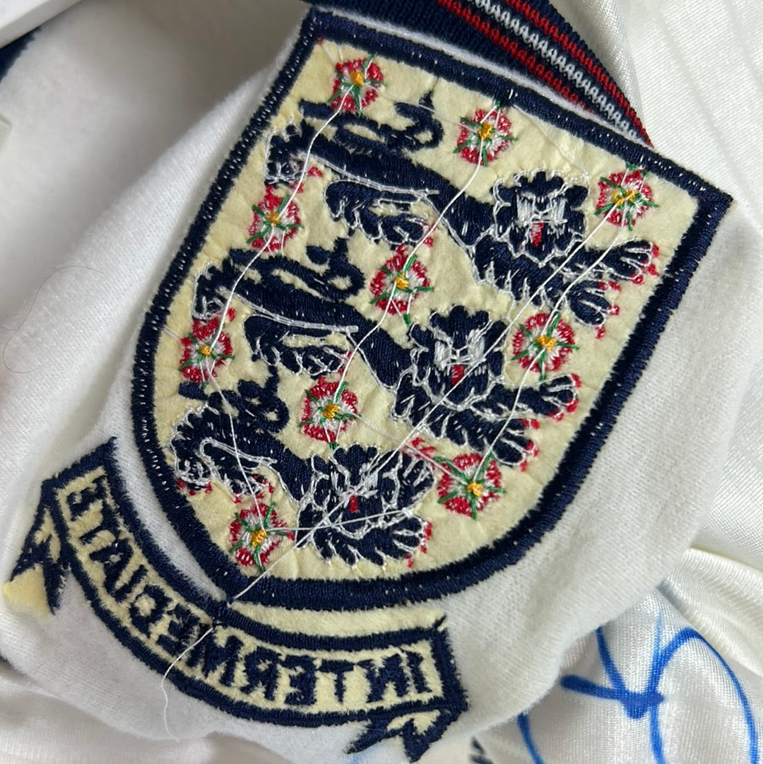 Shirt info: Des Walker only played for the under-21s team once in 1985. They lost 3-1 to Finland on the 21st of May. The shirt has the correct England Intermediate badge for the game. When checking photos of the game the stripes on the shirt align perfectly with the badge on this shirt.