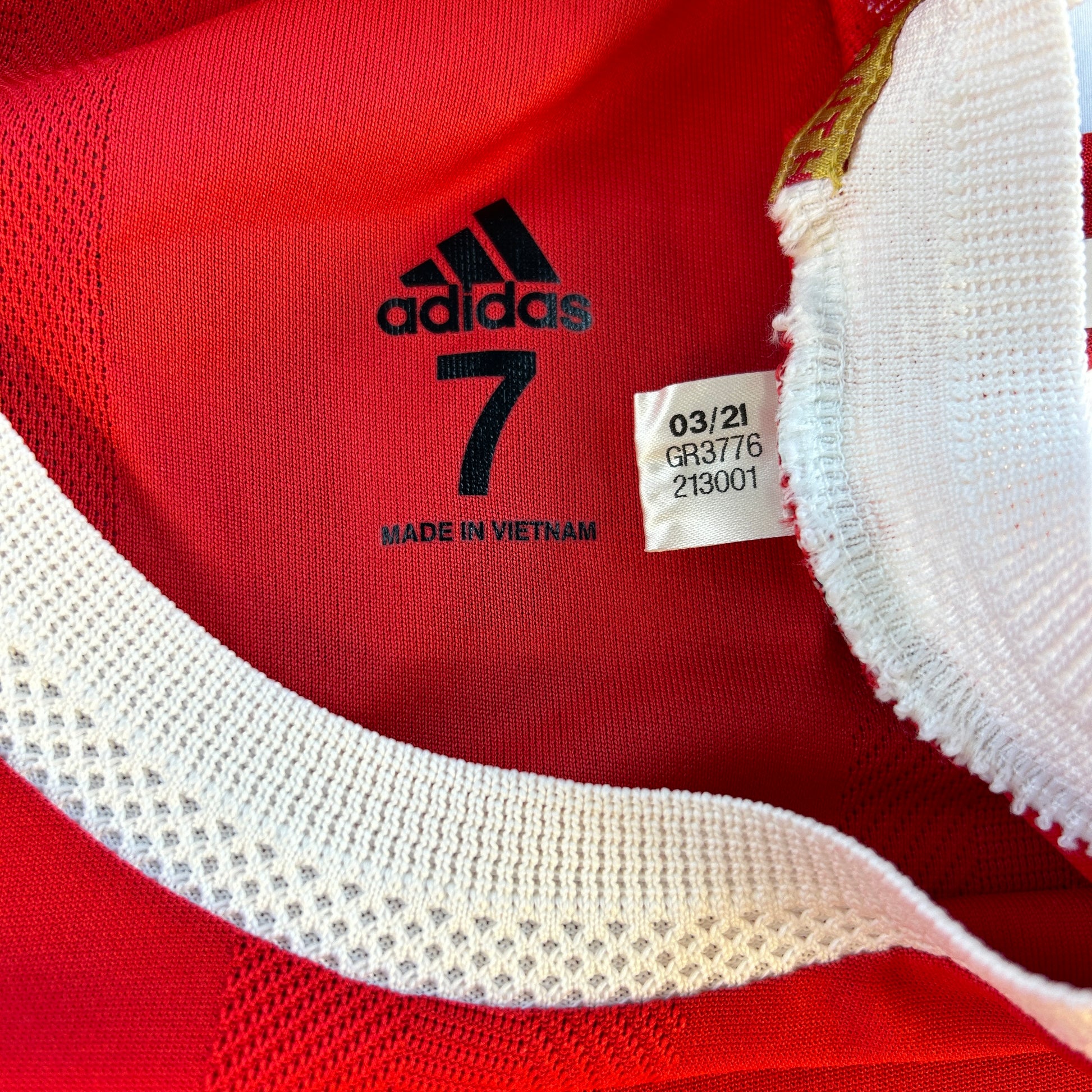 Shirt info: An authentic heat.rdy Manchester United 20/21 home shirt, player issue. It is a size 7 which is only for the players. The shirt has a printed badge and the Adidas logo. It also printed stripes on the sleeve with an extra luminescent to reflect better under bright lights.