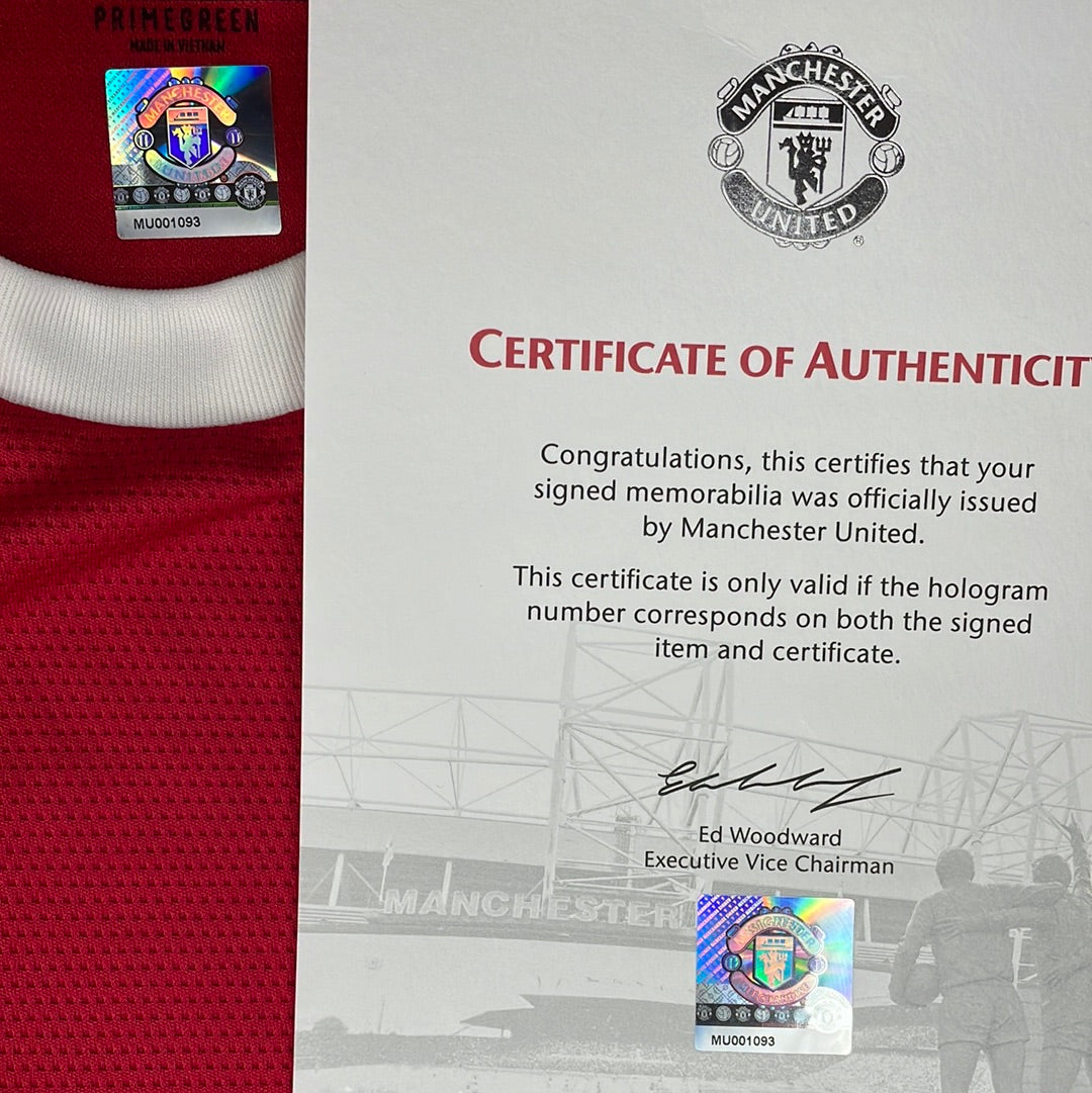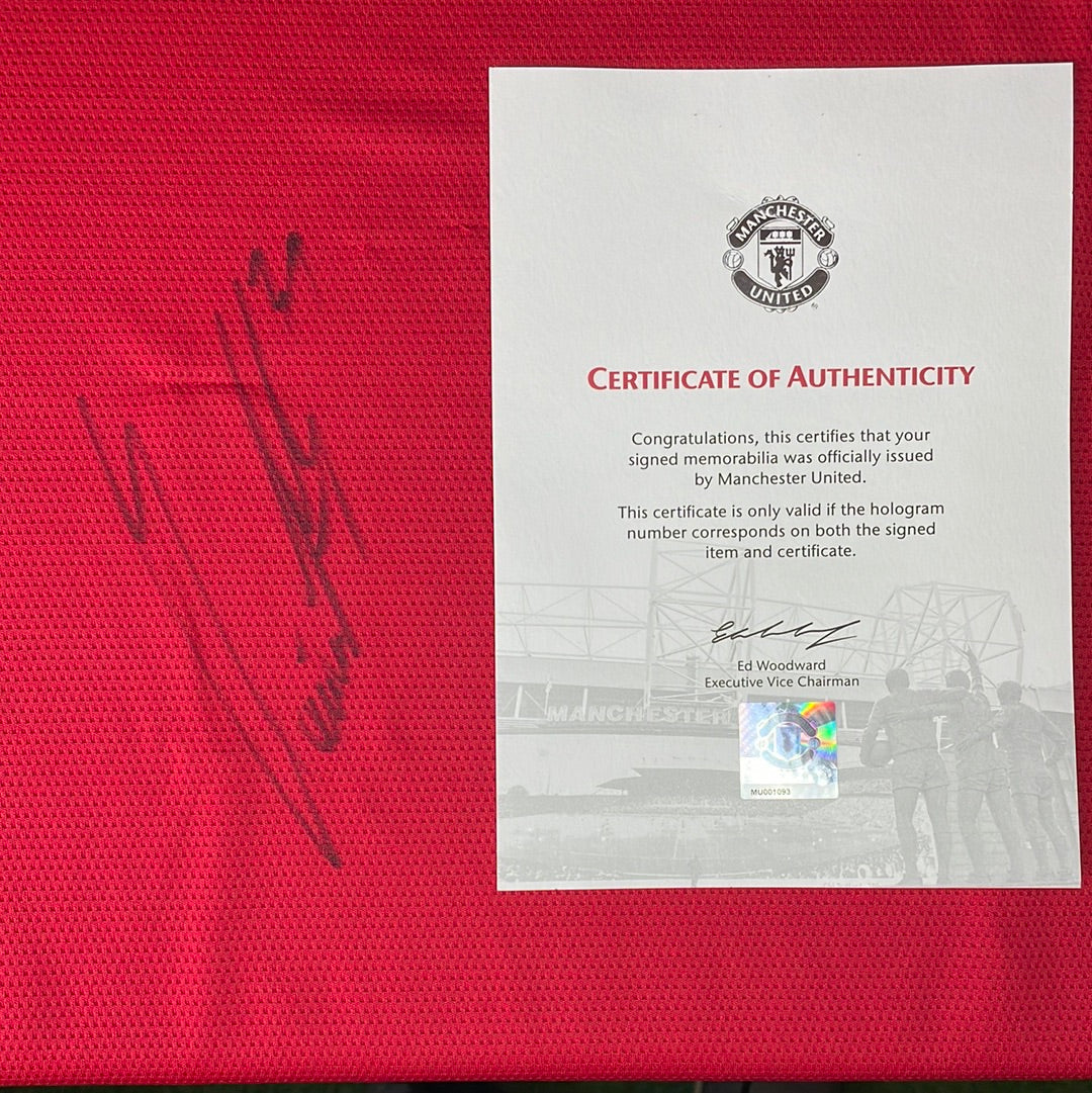Shirt info: The 2021/2022 home shirt for Manchester United. Short sleeve signed on the front. There is a small pull by the signature.