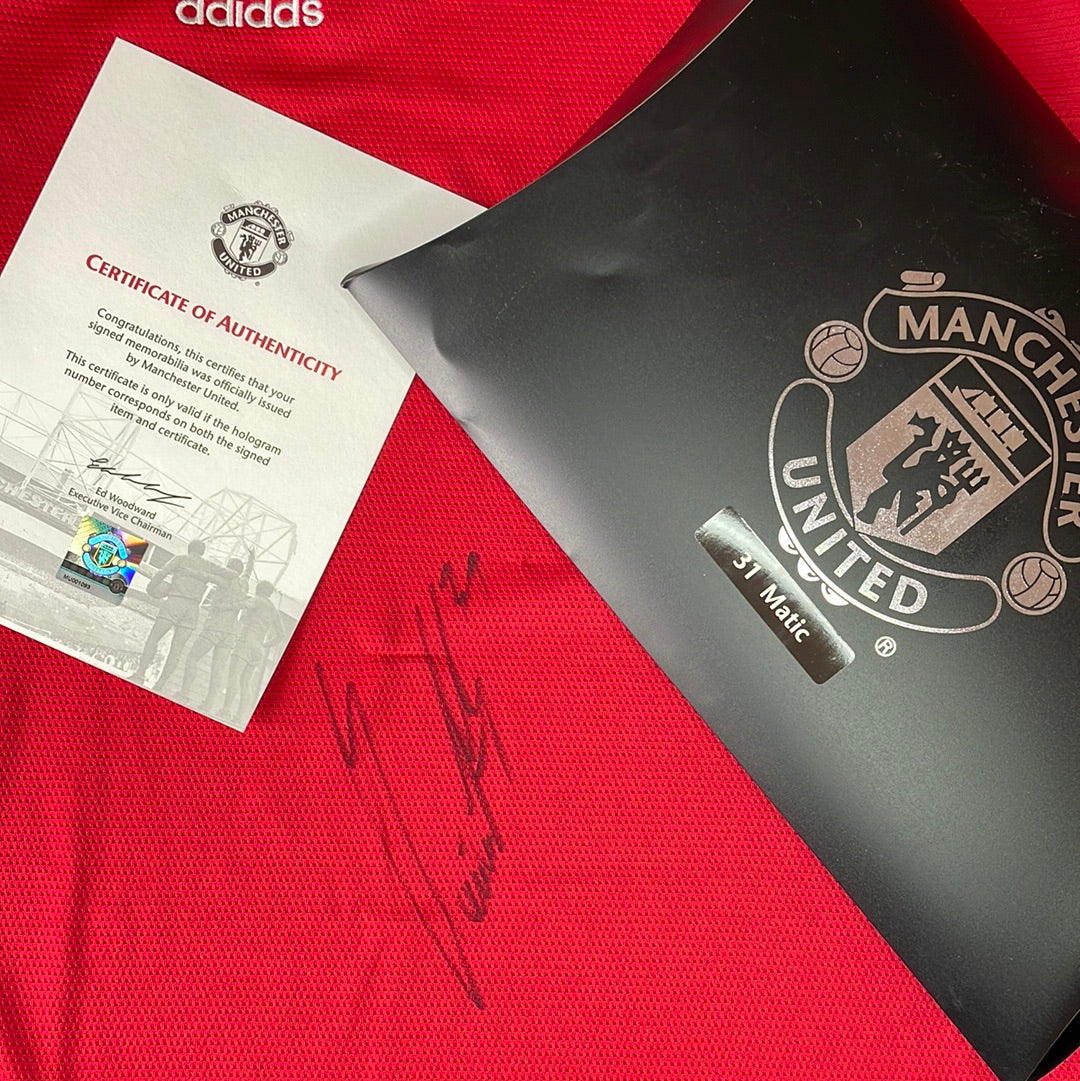 A Manchester United shirt that was signed by Matic in his last season at the club. The shirt comes with a COA from the club and in a club presentation box.