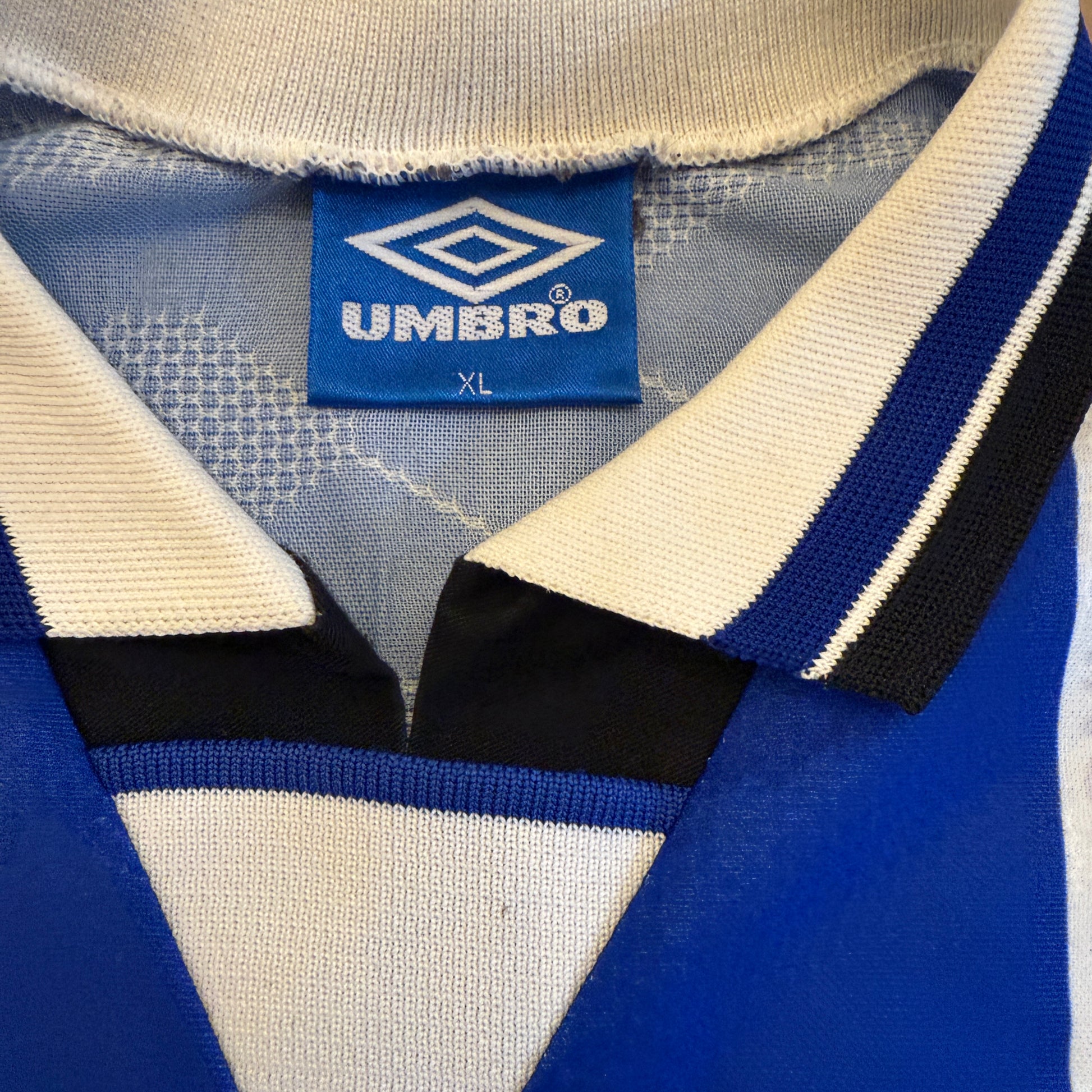 Shirt info: This shirt was used as the third shirt in the 1994/1995 season and the 1995/1996 season. It has a distinctive blue stripe and the names of past players in the design. The Umbro and SHARP are part of the material, and the United badge is embroidered.