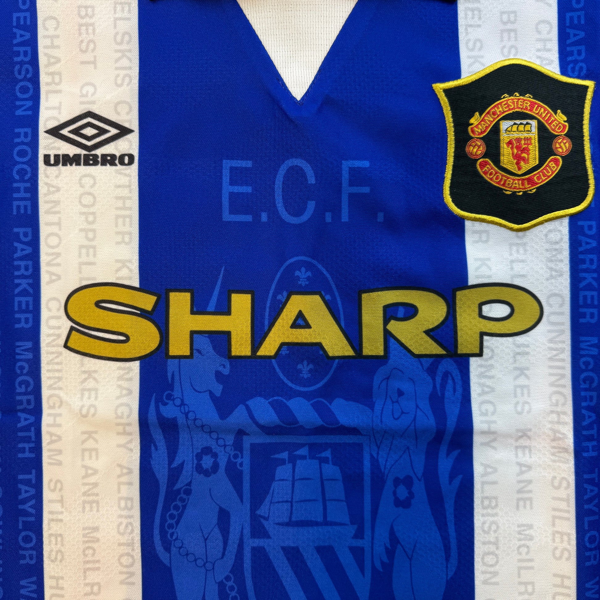 Shirt info: An excellent example of the 1994/1995 third shirt. This was a bold blue stripe design that has the names of Manchester United legends around the shirt. The club's 1968 European Cup winners crest is the main design on the front of the shirt.