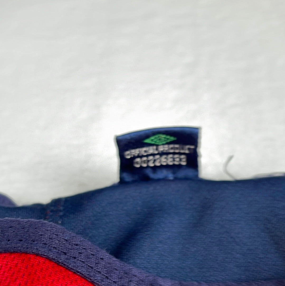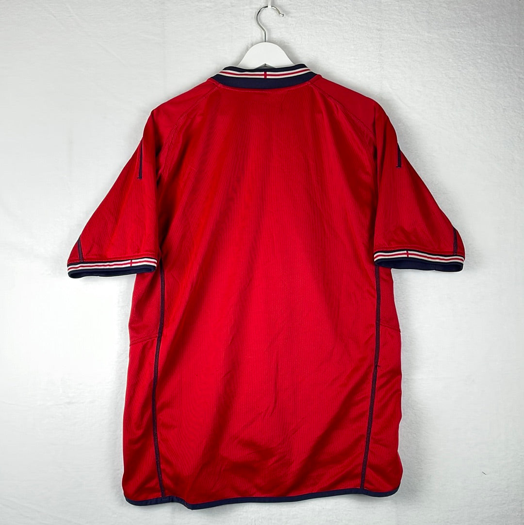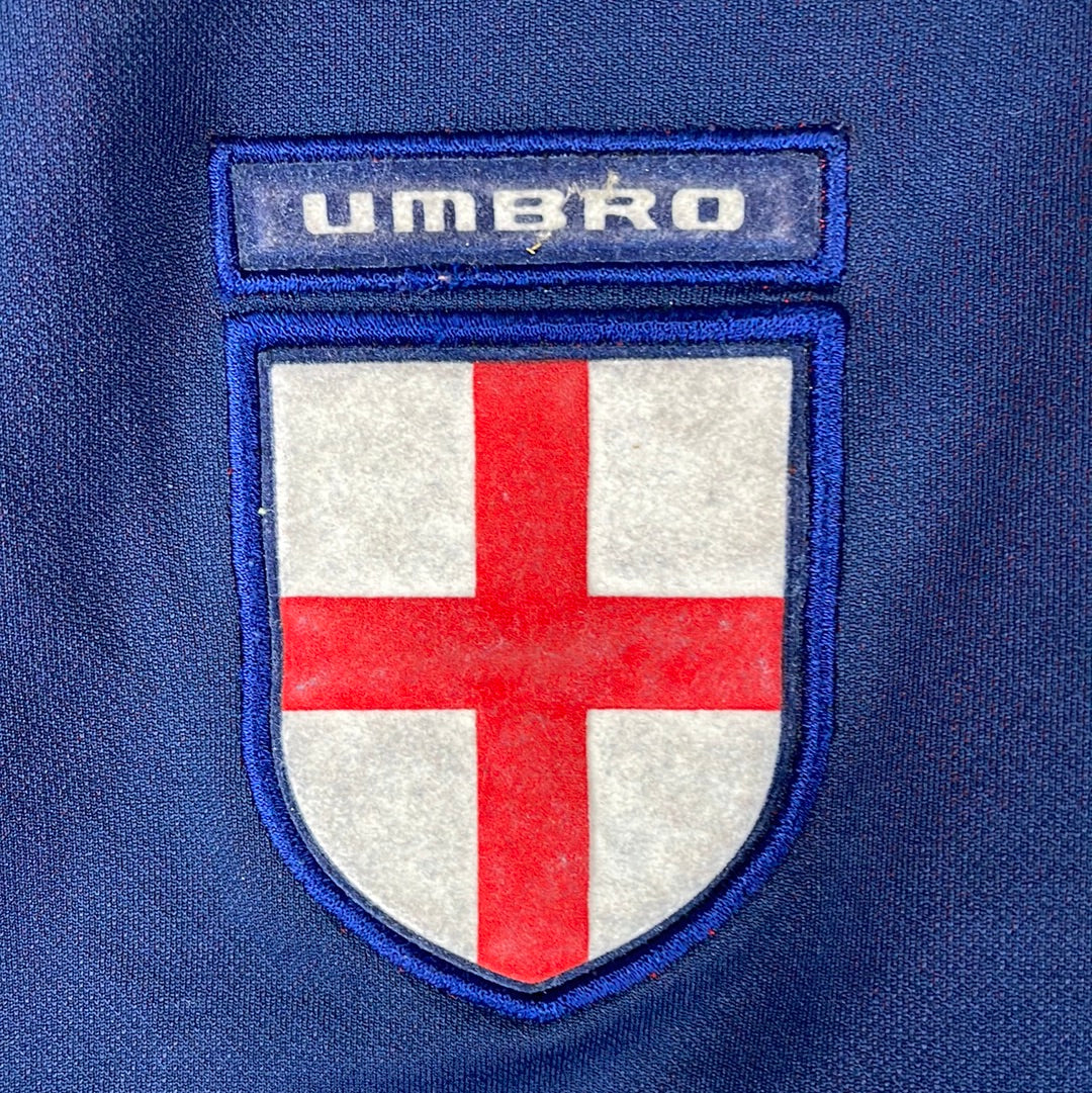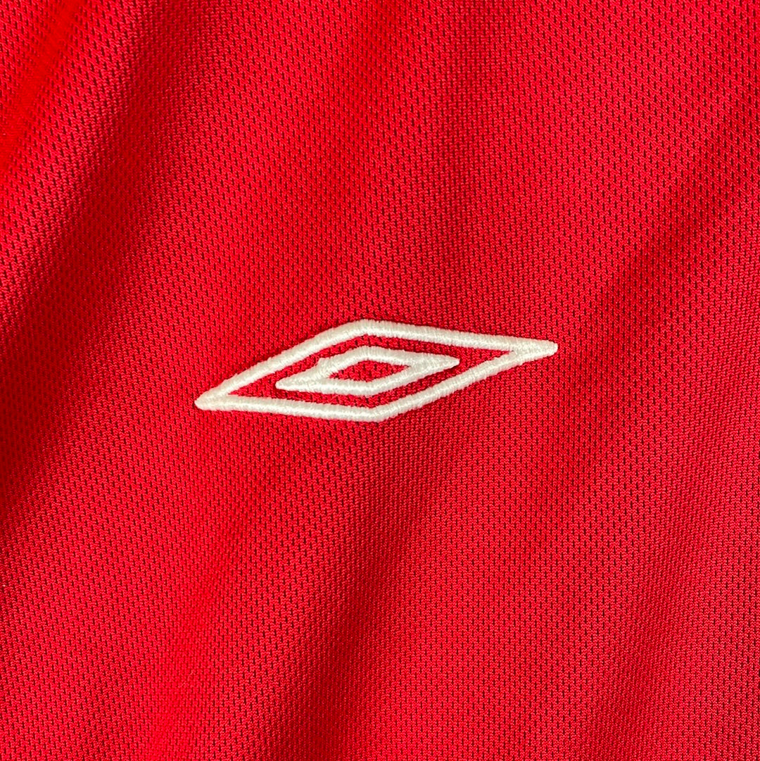 A reversible away and third shirt from England and Umbro in 2002. This has a red side and a blue side.