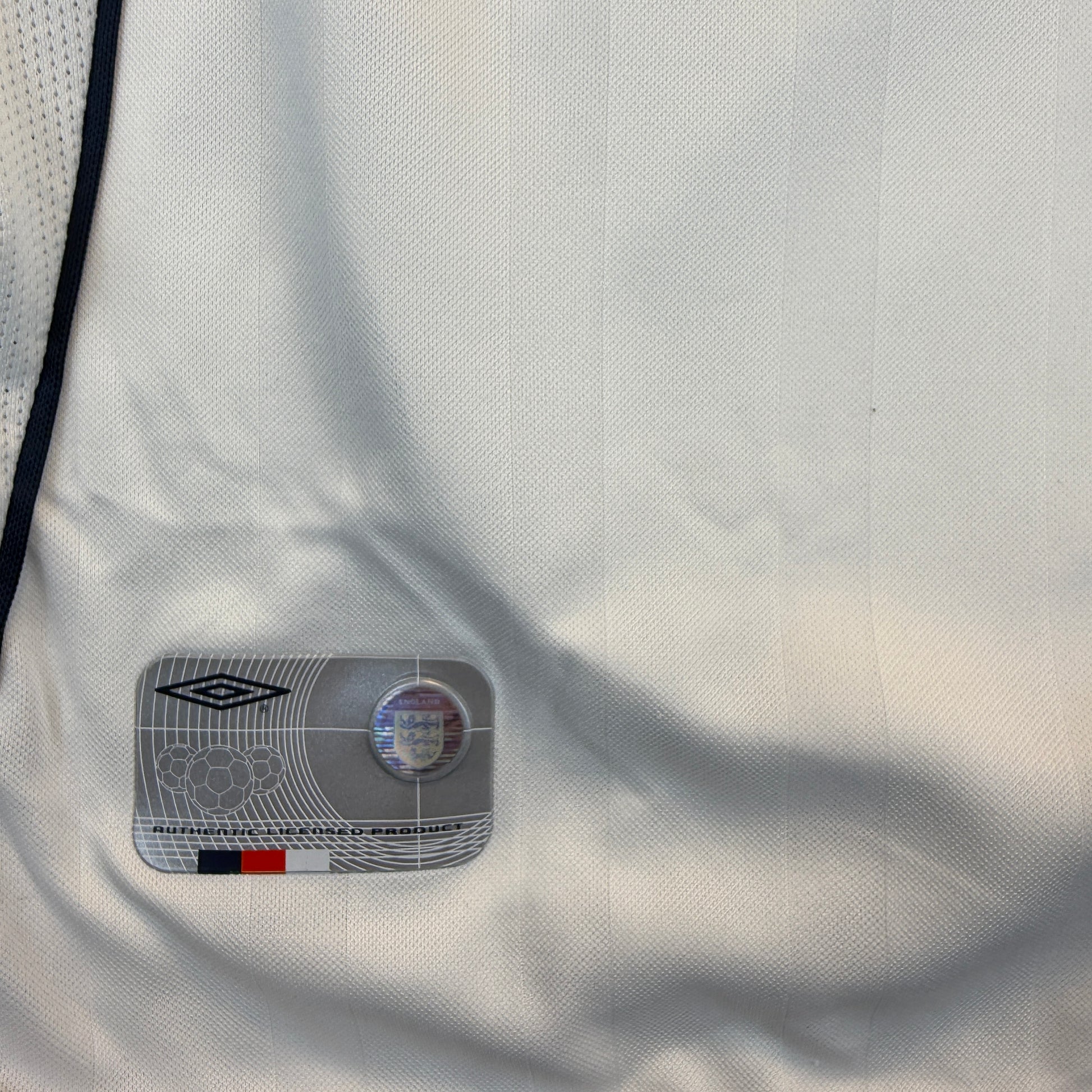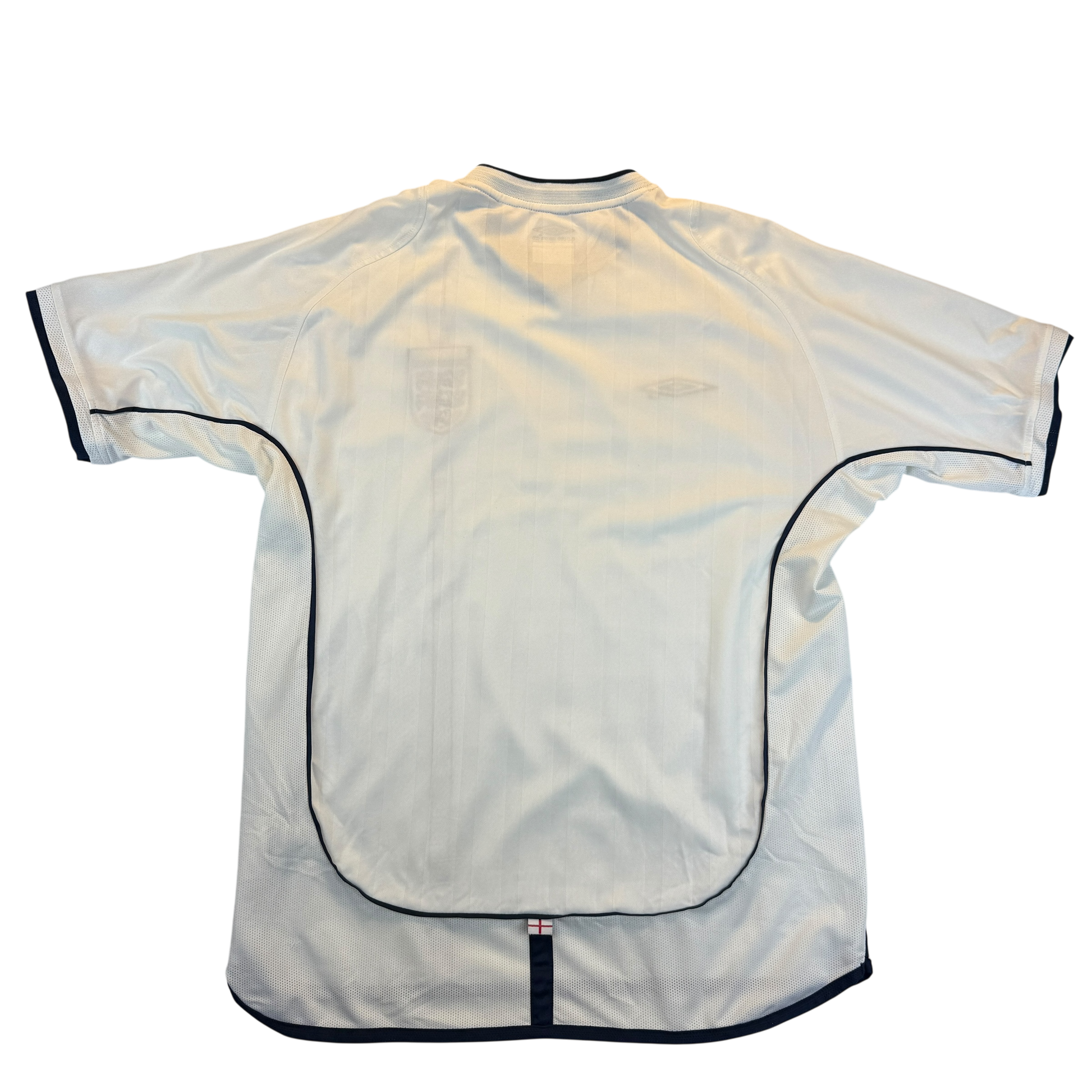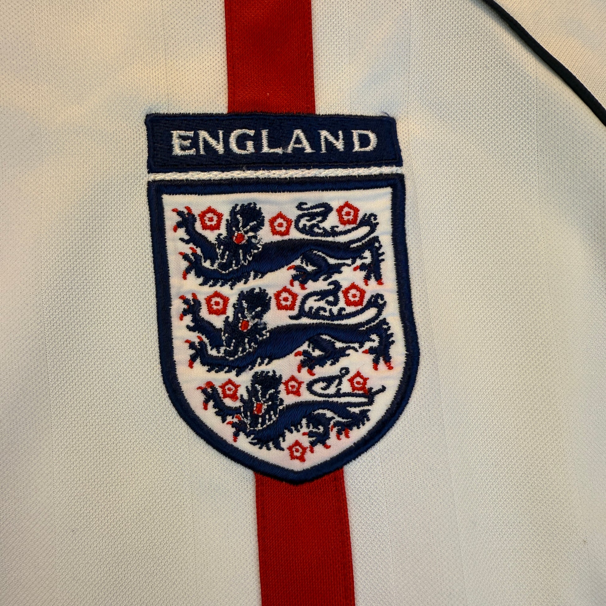 Match Worn: The shirt is the 2001 England home shirt. It has the fully embroidered badge correct for a player's shirt of the time. We do not have any evidence to suggest that this shirt was match-worn or to tie it to a specific player or game. Shirts would always have had a number printed even for an under-21s game.