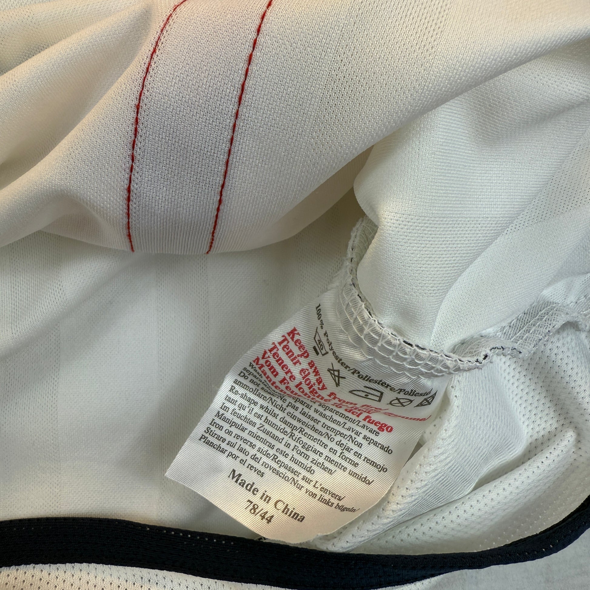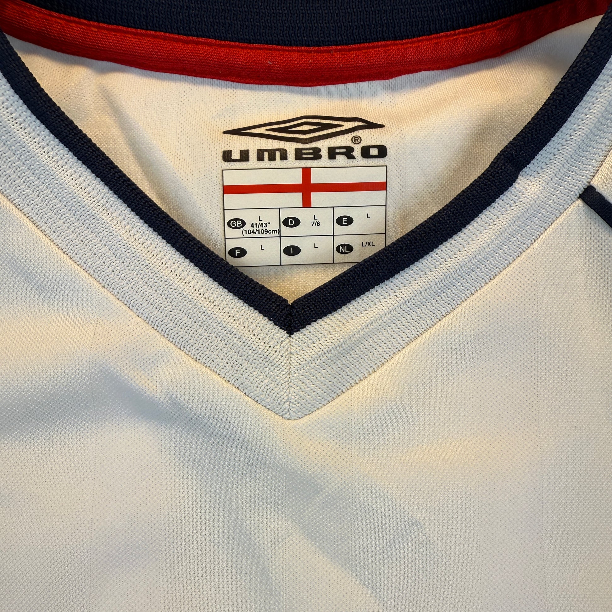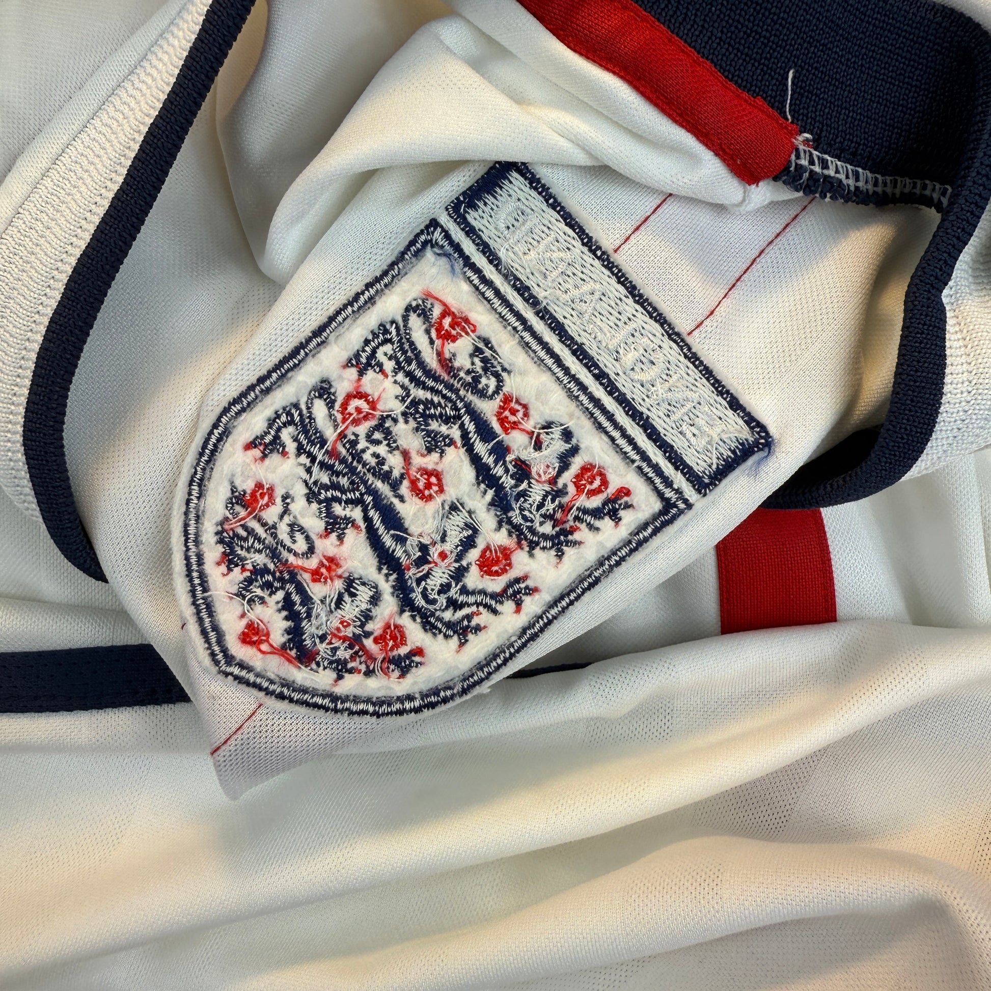 Match Worn: The shirt is the 2001 England home shirt. It has the fully embroidered badge correct for a player's shirt of the time. We do not have any evidence to suggest that this shirt was match-worn or to tie it to a specific player or game. Shirts would always have had a number printed even for an under-21s game.