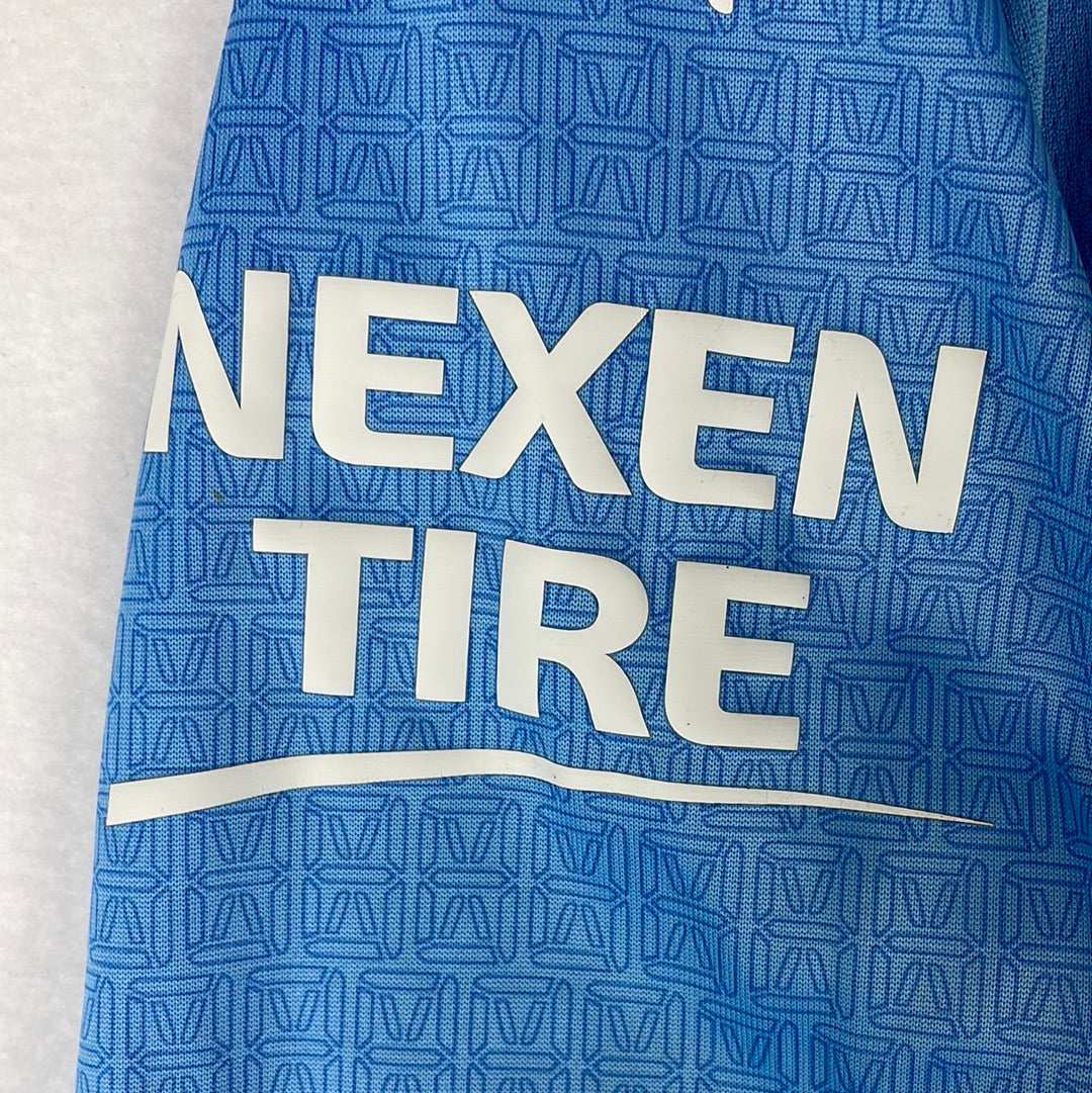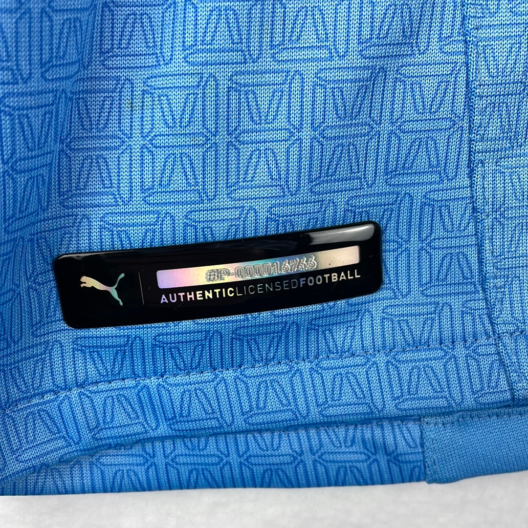 Shirt info: The home shirt from 2021/2022 season with Grealish 10 print. The shirt was designed to commemorate Aguero's league-winning goal. It has 93.20 printed on the back of the neck. The shirt has a time-style pattern all over. The City badge and Puma logos are all printed. It also has the Nexen Tyre sleeve sponsor printed on also.