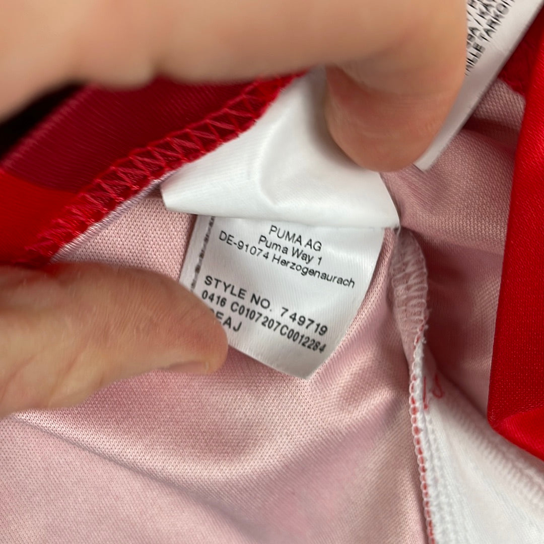 Shirt info: A red shirt with contrasting white collar and sleeves. The shirt has a prominent darker red stripe down the front. The shirt is in 9/10 condition with no marks or defects.