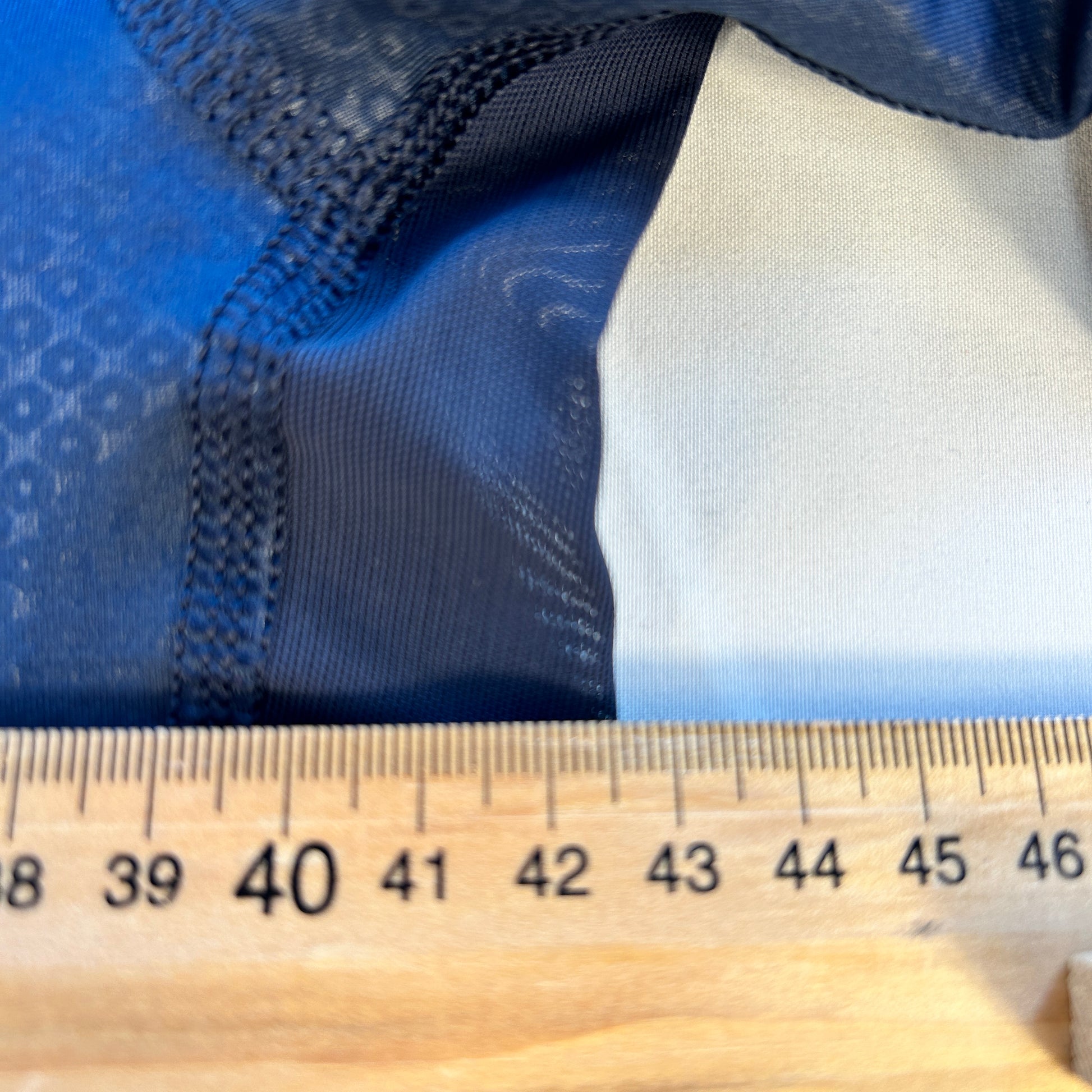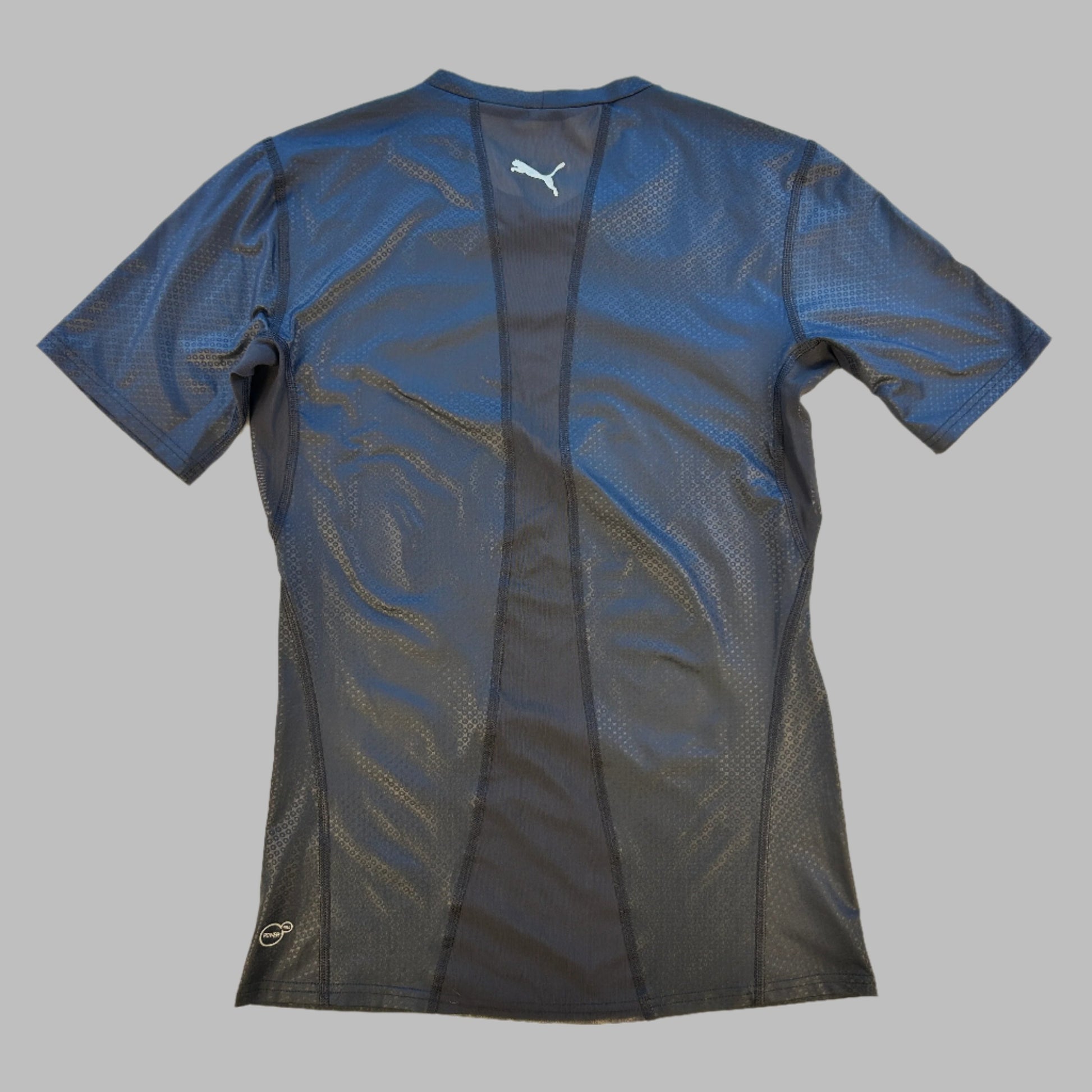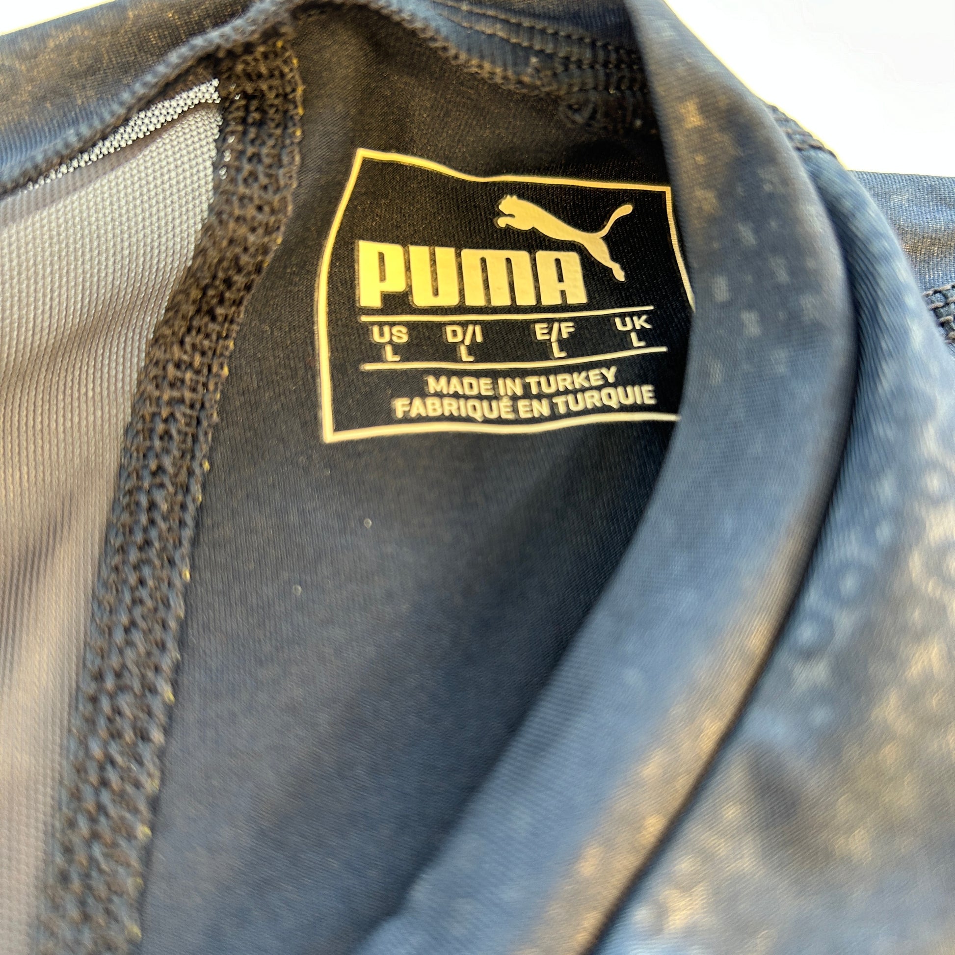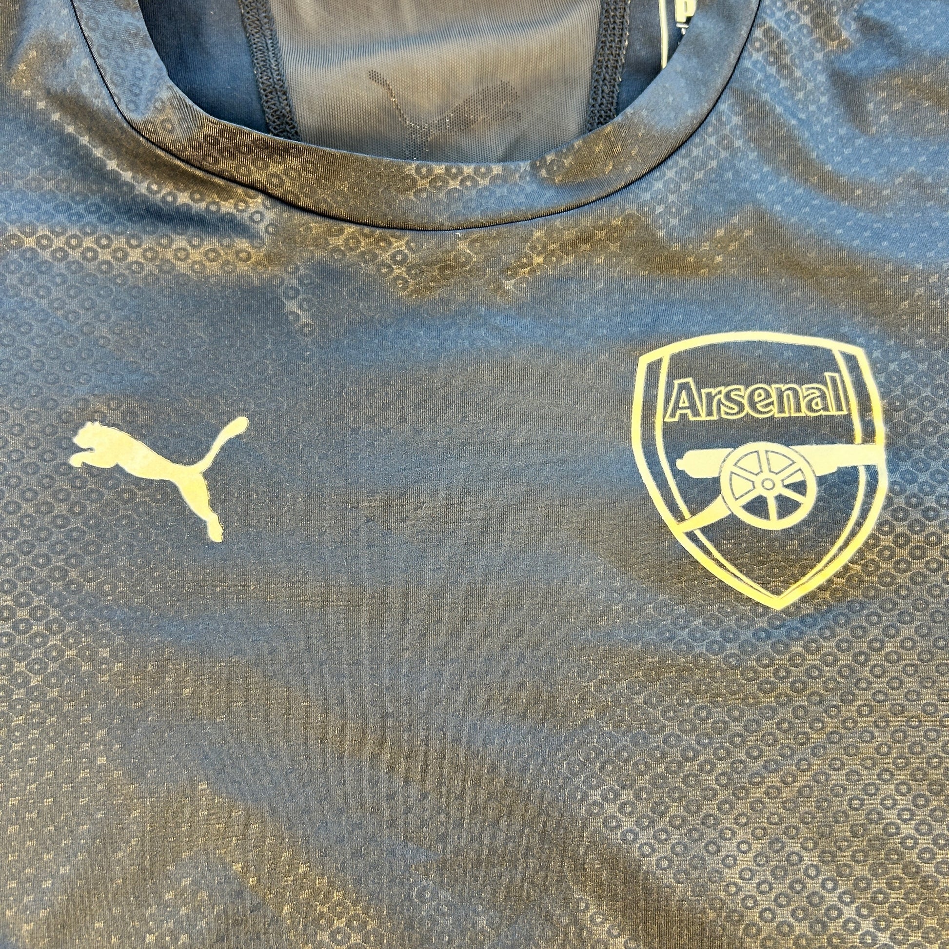 Shirt info: This is a dark blue Arsenal training shirt with a silver-printed Puma logo and an Arsenal badge. It has a patterned material and a shaped cut in the back.